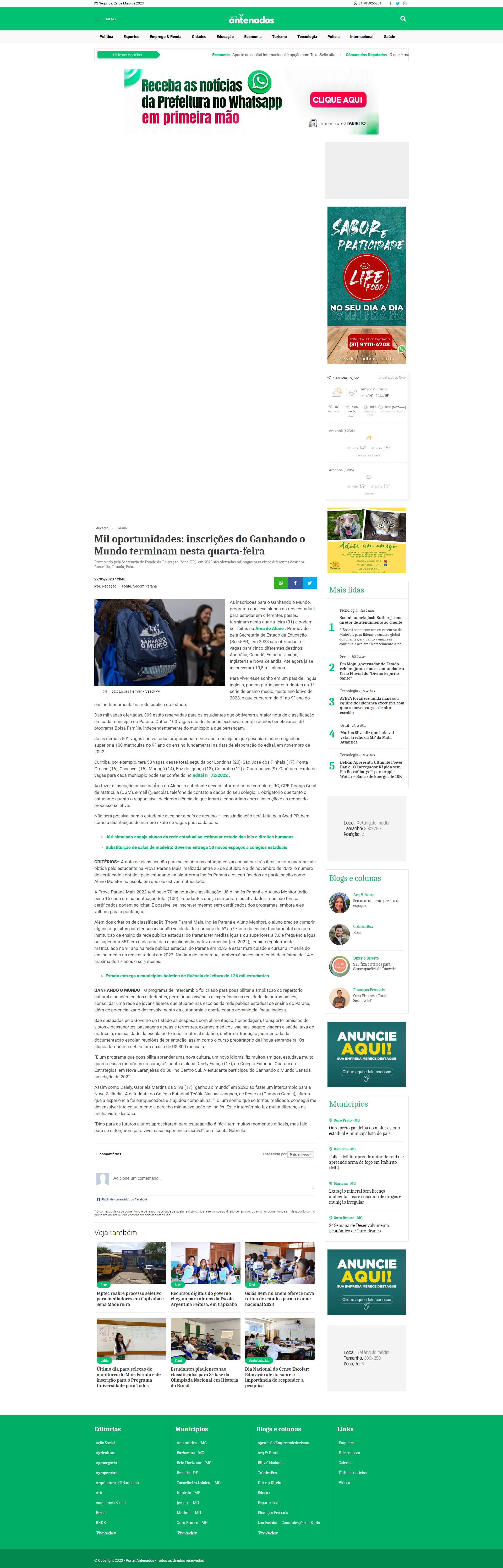Ganhando o Mundo, programa que leva alunos da rede estadual para estudar em diferentes países, terminam nesta quarta-feira (31) e podem ser feitas na Área do Aluno . Promovido pela