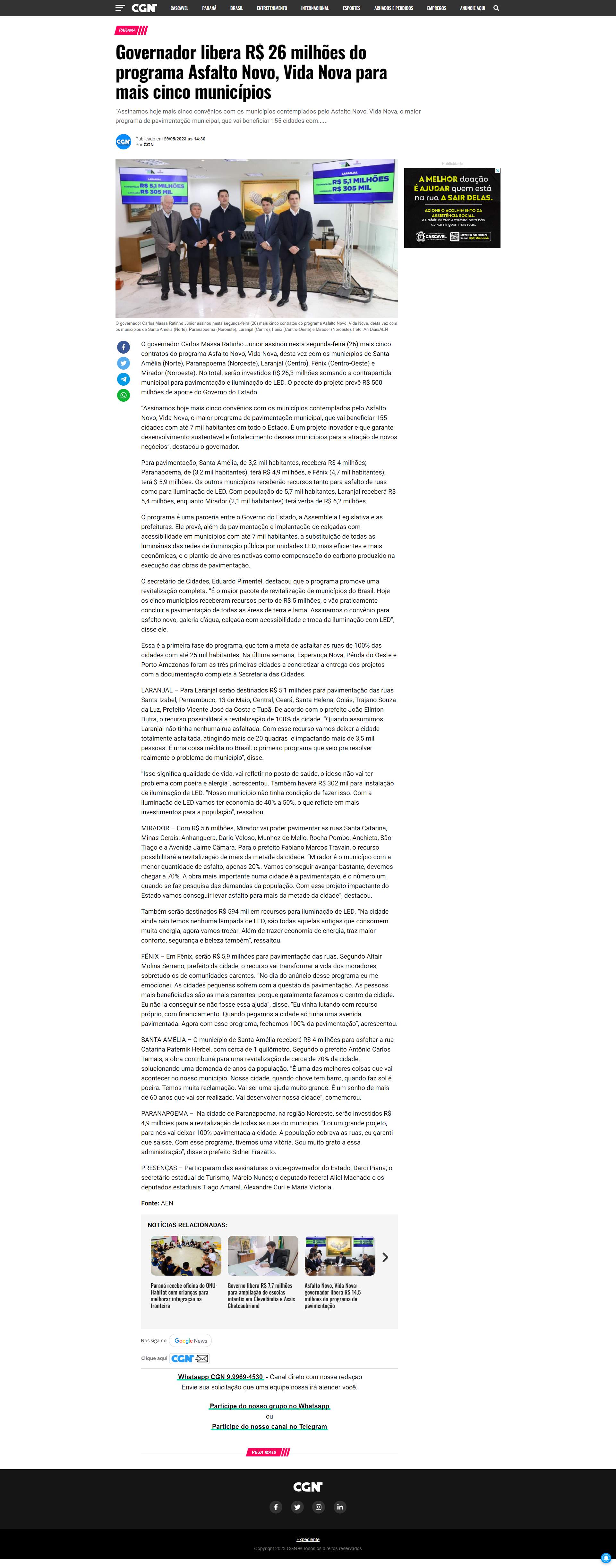 governador Carlos Massa Ratinho Junior assinou nesta segunda-feira (26) mais cinco contratos do programa Asfalto Novo, Vida Nova, desta vez com os municípios de Santa Amélia (Norte), Paranapoema (Noroeste), Laranjal (Centro), Fênix (Centro-Oeste) e Mirador (Noroeste). No total, serão investidos R$ 26,3 milhões somando a contrapartida municipal para pavimentação e iluminação de LED. O pacote do projeto prevê R$ 500 milhões de aporte do