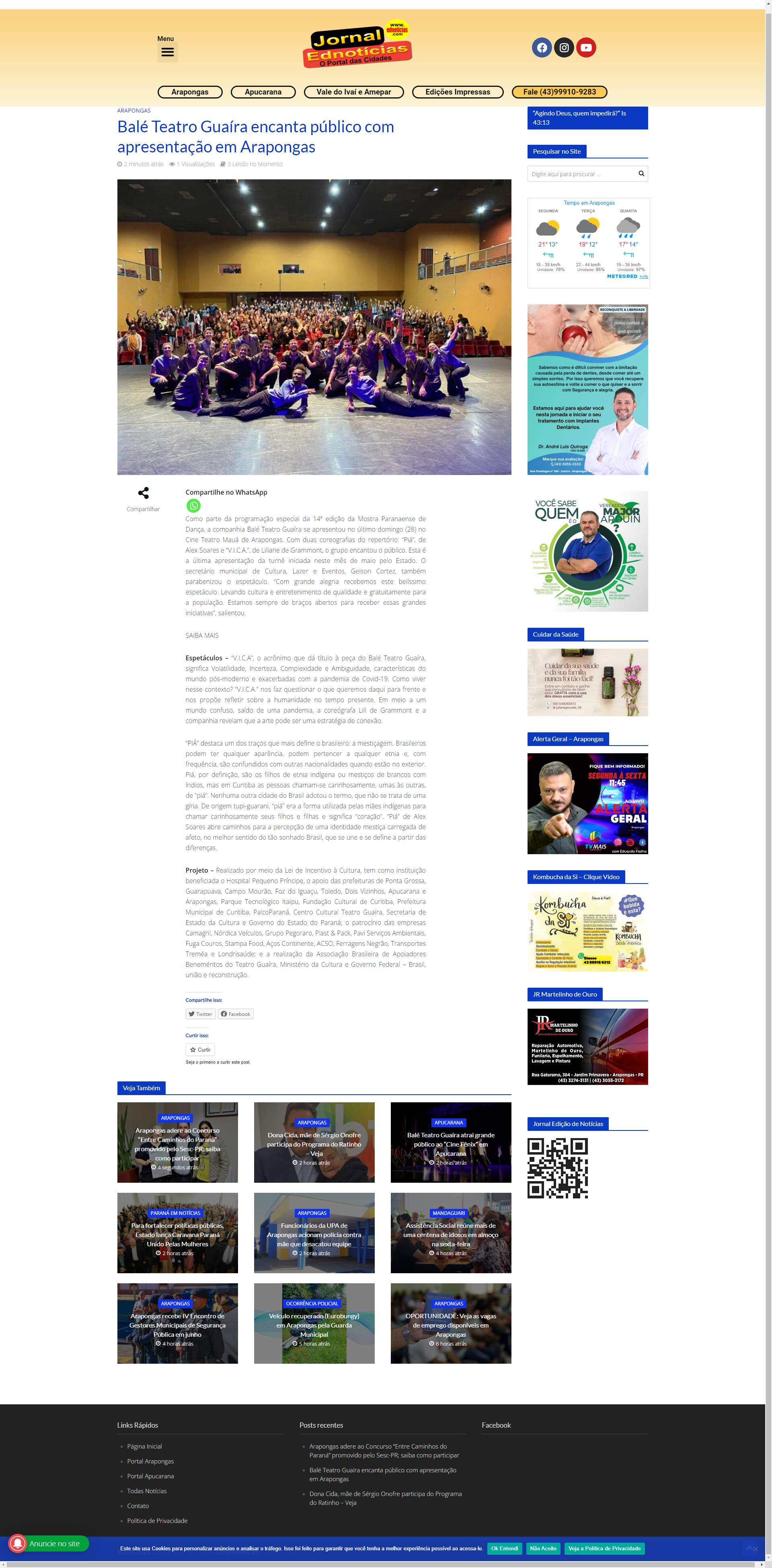 Como parte da programação especial da 14ª edição da Mostra Paranaense de Dança, a companhia Balé Teatro Guaíra se apresentou no último domingo (28) no Cine Teatro Mauá de Arapongas. Com duas coreografias do repertório: “Piá”, de Alex Soares e “V.I.C.A.”, de Liliane de Grammont, o grupo encantou o público. Esta é a última apresentação da turnê iniciada neste mês de maio pelo