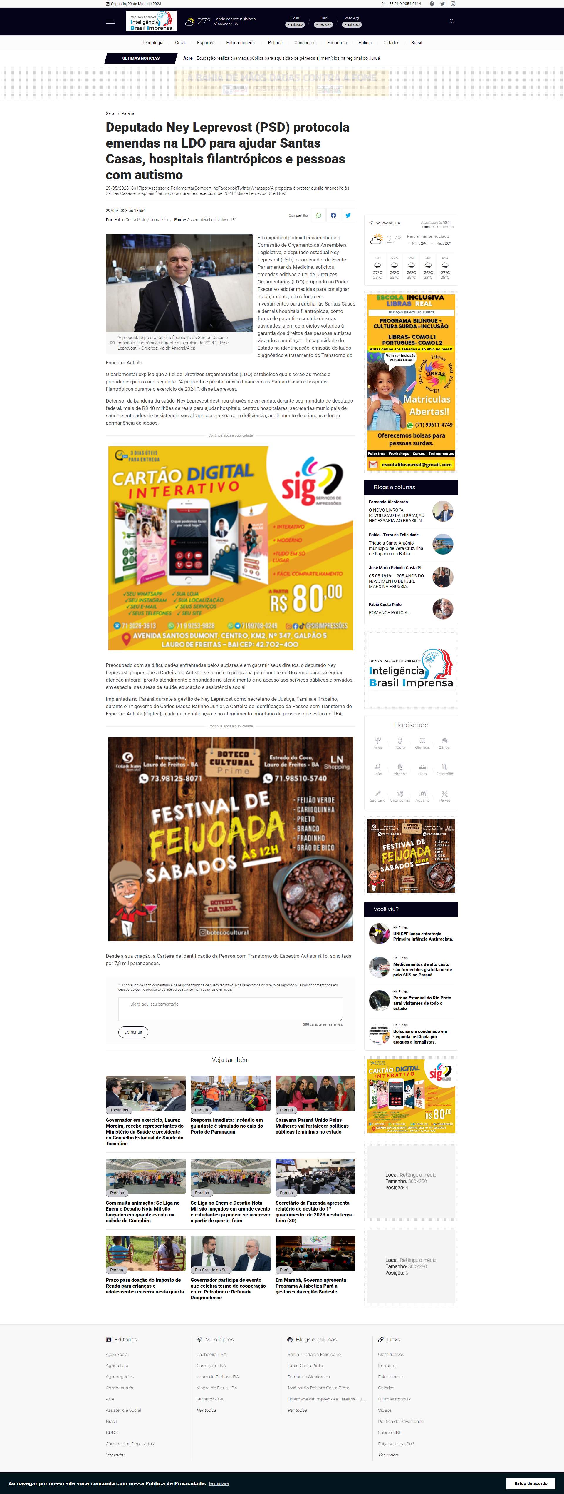 Assembleia Legislativa, o deputado estadual Ney Leprevost (PSD), coordenador da Frente Parlamentar da Medicina, solicitou emendas aditivas à Lei de Diretrizes Orçamentárias (LDO) propondo ao Poder Executivo adotar medidas para consignar no orçamento, um reforço em investimentos para auxiliar às Santas Casas e demais hospitais filantrópicos, como forma de garantir o custeio de suas atividades, além de projetos voltados à garantia dos direitos das pessoas autistas, visando à ampliação da capacidade do