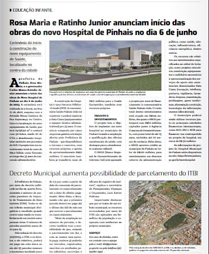 A prefeita de Pinhais, Rosa Maria, e o governador Carlos Massa Ratinho Júnior anunciam o início das obras do Novo Hospital de Pinhais no dia 6 de junho de 2023. A cerimônia será realizada às 9 horas, na Rua 21 de abril, esquina com a Avenida Nossa Senhora da Boa Esperança, no Centro. Esta é a localização do novo equipamento de Saúde, que terá 14.236,42 m² e contará com 90 leitos, sendo 20 de UTIs e atendimento hospitalar exclusivo aos pacientes do SUS. O projeto tem um investimento total de mais de R$1,2 bilhão como fomento ao longo dos 35 anos de concessão administrativa.