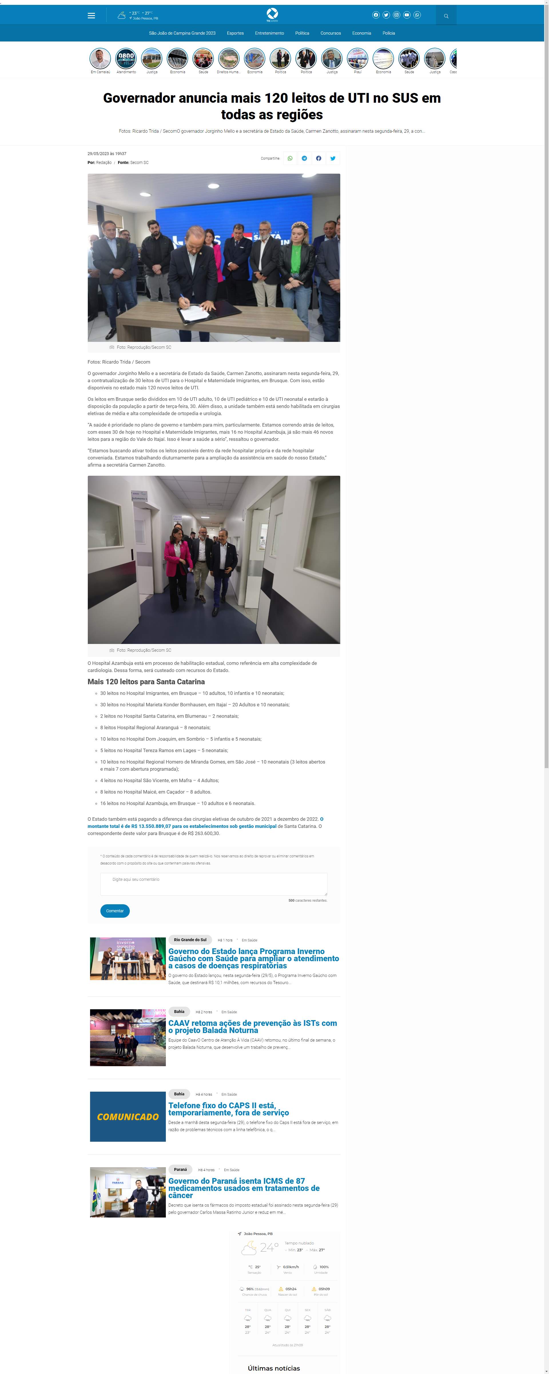30 leitos no Hospital Marieta Konder Bornhausen, em Itajaí - 20 Adultos e 10 neonatais;