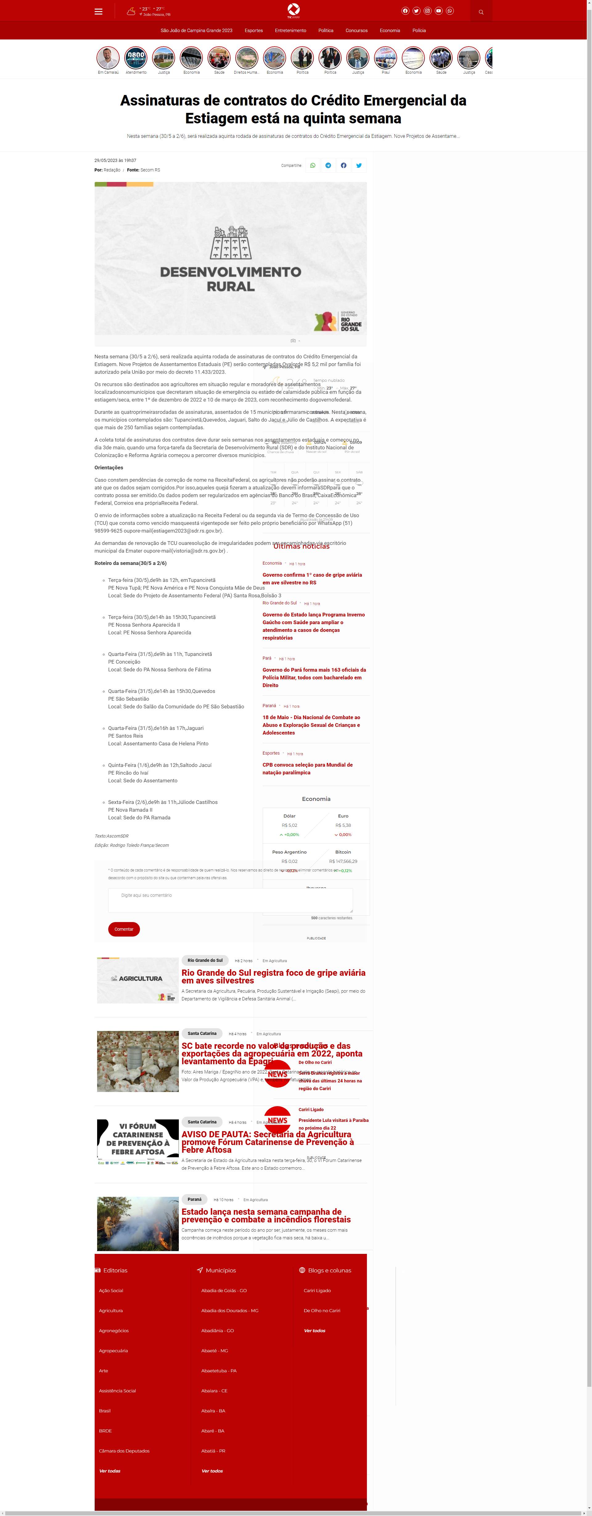 Nesta semana (30/5 a 2/6), será realizada aquinta rodada de assinaturas de contratos do Crédito Emergencial da Estiagem. Nove Projetos de Assentamentos Estaduais (PE) serão contempladas.Ovalorde R$ 5,2 mil por família foi autorizado pela União por meio do decreto 11.433/2023.