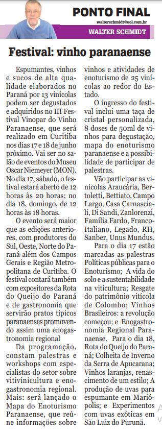 Museu Oscar Niemeyer (MON). No dia 17, sábado, o festival estará aberto de 12 horas às 20 horas; no dia 18, domingo, de 12 horas às 18 horas. O evento será maior que as edições anteriores, com produtores do Sul, Oeste, Norte do Paraná além dos Campos Gerais e Região Metropolitana de Curitiba. O festival contará também com expositores da Rota do Queijo do Paraná e de gastronomia que servirão pratos típicos paranaenses promovendo assim uma enogastronomia regional Da programação, constam palestras e workshops com especialistas do setor sobre vitivinicultura e enogastronomia regional. Mais: será lançado o Mapa do Enoturismo Paranaense, que reúne informações sobre vinhos e atividades de enoturismo de 25 vinícolas ao redor do Estado. O ingresso do festival inclui uma taça de cristal personalizada, 8 doses de 50ml de vinhos para degustação, mapa do enoturismo paranaense e a possibilidade de participar de palestras. Vão participar as vinícolas Araucária, Bertoletti, Bettiato, Campo Largo, Casa Carnasciali, Di Sandi, Zanlorenzi, Família Fardo, FrancoItaliano, Legado, RH, Sanber, Unus Mundus. Para o dia 17 estão marcadas as palestras Políticas públicas para o Enoturismo; A vida do solo e a sustentabilidade na viticultura; Resgate do patrimônio vitícola de Colombo; Vinhos Brasileiros: a revolução começou; e Enogastronomia Regional Paranaense. Para o dia 18, Rota do Queijo do Paraná; Colheita de Inverno da Serra de Apucarana; Vinhos laranjas, renascimento de um estilo; A produção de uvas para espumante em Mariópolis; e Experimentos com uvas exóticas em São Luiz do Purunã.