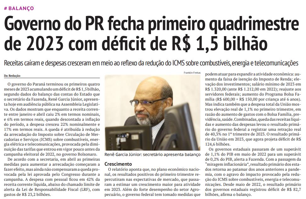 O governo do Paraná terminou os primeiros quatro meses de 2023 acumulando um déficit de R$ 1,5 bilhão, segundo dados do balanço das contas do Estado que o secretário da Fazenda, Renê Garcia Júnior, apresenta hoje em audiência pública na Assembleia Legislativa. Os dados mostram que enquanto a receita corrente entre janeiro e abril caiu 2% em termos nominais, e 6% em termos reais, quando descontada a inflação do período, a despesa cresceu 22% nominalmente e 17% em termos reais. A queda é atribuída à redução da arrecadação do Imposto sobre Circulação de Mercadorias e Serviços (ICMS) sobre combustíveis, energia elétrica e telecomunicações, provocada pela diminuição das tarifas que entrou em vigor pouco antes da campanha eleitoral de 2022, no governo Bolsonaro. De acordo com a secretaria, em abril as primeiras medidas para aumentar a arrecadação começaram a fazer efeito, mas ainda não compensaram a queda provocada pela lei aprovada pelo Congresso durante a campanha. A despesa com pessoal ficou em 42% da receita corrente líquida, abaixo do chamado limite de alerta da Lei de Responsabilidade Fiscal (LRF), com gastos de R$ 23,2 bilhões. Crescimento O relatório aponta que, no plano econômico nacional, os resultados positivos do primeiro trimestre repercutiram nas expectativas de mercado, que passaram a estimar um crescimento maior para atividade em 2023. Além do forte desempenho do setor Agropecuário, o governo federal tem tomado medidas que podem atuar para expandir a atividade econômica: aumento da faixa de isenção do Imposto de Renda; elevação dos investimentos; salário mínimo de 2023 em R$ 1.320,00 (ante R$ 1.212,00 em 2022); reajuste aos servidores federais; aumento do Programa Bolsa Família (R$ 600,00 + R$ 150,00 por criança até 6 anos). Mas indica também que a despesa total da União mostrou elevação real de 1,1% no primeiro trimestre, em razão do aumento de gastos com o Bolsa Família, previdência, saúde. Combinadas, queda das receitas líquidas e aumento das despesas levou o resultado primário do governo federal a registrar uma retração real de 40,3% no 1º trimestre de 2023. O resultado primário da União em 2023, que agora projeta déficit de R$ 124,6 bilhões. Os governos estaduais passaram de um superávit de 1,1% do PIB em maio de 2022 para um superávit de 0,2% do PIB, alerta a Fazenda. Com a passagem da “miragem inflacionária”, resultado primário dos estados retorna ao patamar dos anos anteriores a pandemia, com o agravo do impacto provocado pela redução do ICMS sobre combustíveis, energia e telecomunicações. Desde maio de 2022, o resultado primário dos governos estaduais registrou déficit de R$ 82,7 bilhões, afirma o balanço.