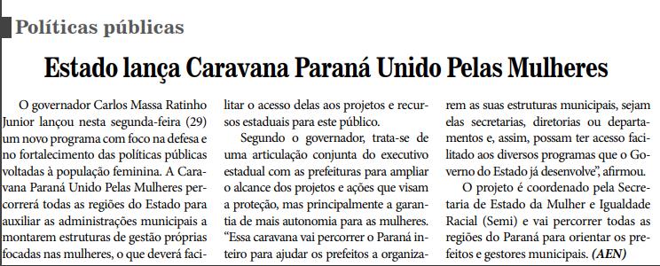 O governador Carlos Massa Ratinho Junior lançou nesta segunda-feira (29) um novo programa com foco na defesa e no fortalecimento das políticas públicas voltadas à população feminina. A Caravana Paraná Unido Pelas Mulheres percorrerá todas as regiões do Estado para auxiliar as administrações municipais a montarem estruturas de gestão próprias focadas nas mulheres, o que deverá facilitar o acesso delas aos projetos e recursos estaduais para este público. Segundo o governador, trata-se de uma articulação conjunta do executivo estadual com as prefeituras para ampliar o alcance dos projetos e ações que visam a proteção, mas principalmente a garantia de mais autonomia para as mulheres. “Essa caravana vai percorrer o Paraná inteiro para ajudar os prefeitos a organizarem as suas estruturas municipais, sejam elas secretarias, diretorias ou departamentos e, assim, possam ter acesso facilitado aos diversos programas que o Governo do Estado já desenvolve”, afi rmou. O projeto é coordenado pela Secretaria de Estado da Mulher e Igualdade Racial (Semi) e vai percorrer todas as regiões do Paraná para orientar os prefeitos e gestores municipais. (AEN)