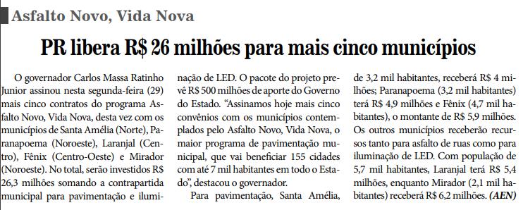 O governador Carlos Massa Ratinho Junior assinou nesta segunda-feira (29) mais cinco contratos do programa Asfalto Novo, Vida Nova, desta vez com os municípios de Santa Amélia (Norte), Paranapoema (Noroeste), Laranjal (Centro), Fênix (Centro-Oeste) e Mirador (Noroeste). No total, serão investidos R$ 26,3 milhões somando a contrapartida municipal para pavimentação e iluminação de LED. O pacote do projeto prevê R$ 500 milhões de aporte do Governo do Estado. “Assinamos hoje mais cinco convênios com os municípios contemplados pelo Asfalto Novo, Vida Nova, o maior programa de pavimentação municipal, que vai benefi ciar 155 cidades com até 7 mil habitantes em todo o Estado”, destacou o governador. Para pavimentação, Santa Amélia, de 3,2 mil habitantes, receberá R$ 4 milhões; Paranapoema (3,2 mil habitantes) terá R$ 4,9 milhões e Fênix (4,7 mil habitantes), o montante de R$ 5,9 milhões. Os outros municípios receberão recursos tanto para asfalto de ruas como para iluminação de LED. Com população de 5,7 mil habitantes, Laranjal terá R$ 5,4 milhões, enquanto Mirador (2,1 mil habitantes) receberá R$ 6,2 milhões. (AEN)