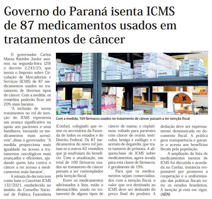 O governador Carlos Massa Ratinho Junior assinou na segunda-feira (29) o decreto 2.243/23, que isenta o Imposto sobre Circulação de Mercadorias e Serviços (ICMS) de 87 medicamentos usados no tratamento de diversos tipos de câncer. Com a medida, os remédios poderão ficar até 20% mais baratos. “A inclusão de novos tratamentos no rol de isenção do ICMS representa um avanço significativo no apoio aos pacientes e seus familiares, tornando os medicamentos mais acessíveis”, disse o governador. “A medida proporciona mais igualdade no acesso a tratamentos oncológicos mais avançados e eficientes, ajudando quem luta contra o câncer a ter acesso a medicamentos mais baratos”. A minuta do decreto tem como base o Convênio ICMS 132/2021, estabelecido no âmbito do Conselho Nacional de Política Fazendária (Confaz), colegiado que reúne os secretários da Fazenda de todos os estados e do Distrito Federal. Os 87 medicamentos do novo rol juntam-se a outros 82 remédios que já usufruíam do benefício. Com a atualização, um total de 169 fármacos usados no tratamento de câncer passam a ser contemplados pela isenção fiscal. Entre os medicamentos adicionados à lista, estão o abemaciclibe, usado no tratamento de alguns tipos de câncer de mama; o cisplatinum, voltado para pacientes com câncer de ovário, testículos, bexiga e esôfago; e o acetato de degarelix, que trata tumores de próstata. A alíquota-base de ICMS sobre medicamentos, agora zerada para esta classe de fármacos, é geralmente de 19%. Para que os medicamentos sejam comercializados com a isenção fiscal, o valor que era destinado ao ICMS deve ser deduzido do preço final do produto. A dedução deve ser expressamente demonstrada no documento fiscal. A prática gera transparência e garante o acesso aos benefícios fiscais pela população. A ampliação da lista de medicamentos isentos de ICMS foi discutida e acordada no Confaz, instância responsável por promover a cooperação e a uniformização das políticas fiscais entre os estados brasileiros. A isenção já está em vigor. (AEN)