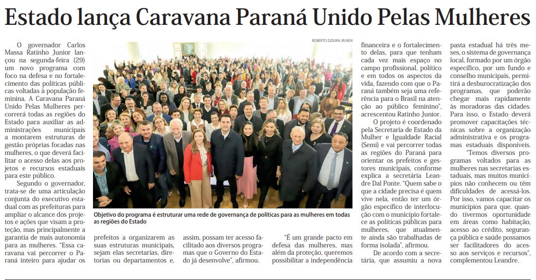 O governador Carlos Massa Ratinho Junior lançou na segunda-feira (29) um novo programa com foco na defesa e no fortalecimento das políticas públicas voltadas à população feminina. A Caravana Paraná Unido Pelas Mulheres percorrerá todas as regiões do Estado para auxiliar as administrações municipais a montarem estruturas de gestão próprias focadas nas mulheres, o que deverá facilitar o acesso delas aos projetos e recursos estaduais para este público. Segundo o governador, trata-se de uma articulação conjunta do executivo estadual com as prefeituras para ampliar o alcance dos projetos e ações que visam a proteção, mas principalmente a garantia de mais autonomia para as mulheres. “Essa caravana vai percorrer o Paraná inteiro para ajudar os prefeitos a organizarem as suas estruturas municipais, sejam elas secretarias, diretorias ou departamentos e, assim, possam ter acesso facilitado aos diversos programas que o Governo do Estado já desenvolve”, afirmou. “É um grande pacto em defesa das mulheres, mas além da proteção, queremos possibilitar a independência financeira e o fortalecimento delas, para que tenham cada vez mais espaço no campo profissional, político e em todos os aspectos da vida, fazendo com que o Paraná também seja uma referência para o Brasil na atenção ao público feminino”, acrescentou Ratinho Junior. O projeto é coordenado pela Secretaria de Estado da Mulher e Igualdade Racial (Semi) e vai percorrer todas as regiões do Paraná para orientar os prefeitos e gestores municipais, conforme explica a secretária Leandre Dal Ponte. “Quem sabe o que a cidade precisa é quem vive nela, então ter um órgão específico de interlocução com o município fortalece as políticas públicas para mulheres, que atualmente ainda são trabalhadas de forma isolada”, afirmou. De acordo com a secretária, que assumiu a nova pasta estadual há três meses, o sistema de governança local, formado por um órgão específico, por um fundo e conselho municipais, permitirá a desburocratização dos programas, que poderão chegar mais rapidamente às moradoras das cidades. Para isso, o Estado deverá promover capacitações técnicas sobre a organização administrativa e os programas estaduais disponíveis. “Temos diversos programas voltados para as mulheres nas secretarias estaduais, mas muitos municípios não conhecem ou têm dificuldades de acessá-los. Por isso, vamos capacitar os municípios para que. quando tivermos oportunidade em áreas como habitação, acesso ao crédito, segurança pública e saúde possamos ser facilitadores do acesso aos serviços e recursos”, complementou Leandre.