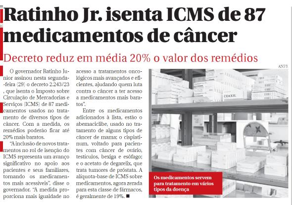 Ratinho Jr. isenta ICMS de 87 medicamentos de câncer