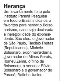 Um levantamento feito pelo Instituto Paraná Pesquisa em todo o Brasil indica os 5 favoritos para herdar o Bolsonarismo, caso seja declarada a inelegibilidade do ex-presidente. São eles: o governador de São Paulo, Tarcísio Freitas (Repubicanos), Michele Bolsonaro, ex-primeira-dama, governador de Minas Gerais, Romeu Zema, o filho de Bolsonaro, o senador Flávio Bolsonaro e o governador do Paraná, Ratinho Junior.