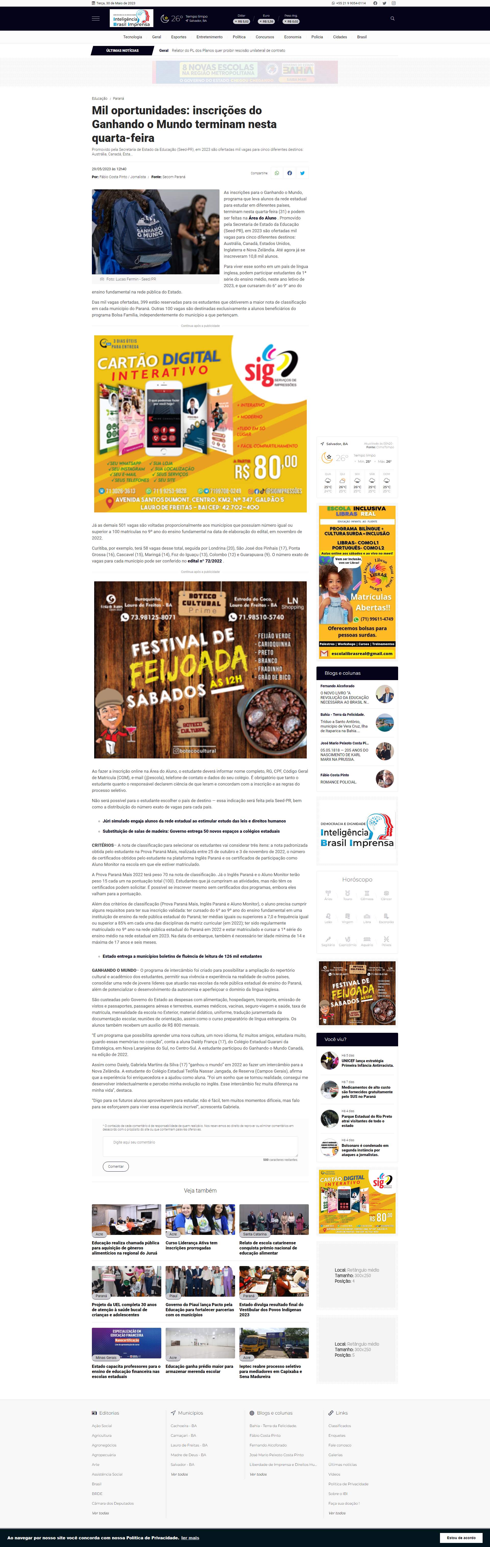 As inscrições para o Ganhando o Mundo, programa que leva alunos da rede estadual para estudar em diferentes países, terminam nesta quarta-feira (31) e podem ser feitas na Área do Aluno . Promovido pela Secretaria de Estado da Educação (Seed-PR), em 2023 são ofertadas mil vagas para cinco diferentes destinos: Austrália, Canadá, Estados Unidos, Inglaterra e Nova Zelândia. Até agora já se inscreveram 10,8 mil alunos.