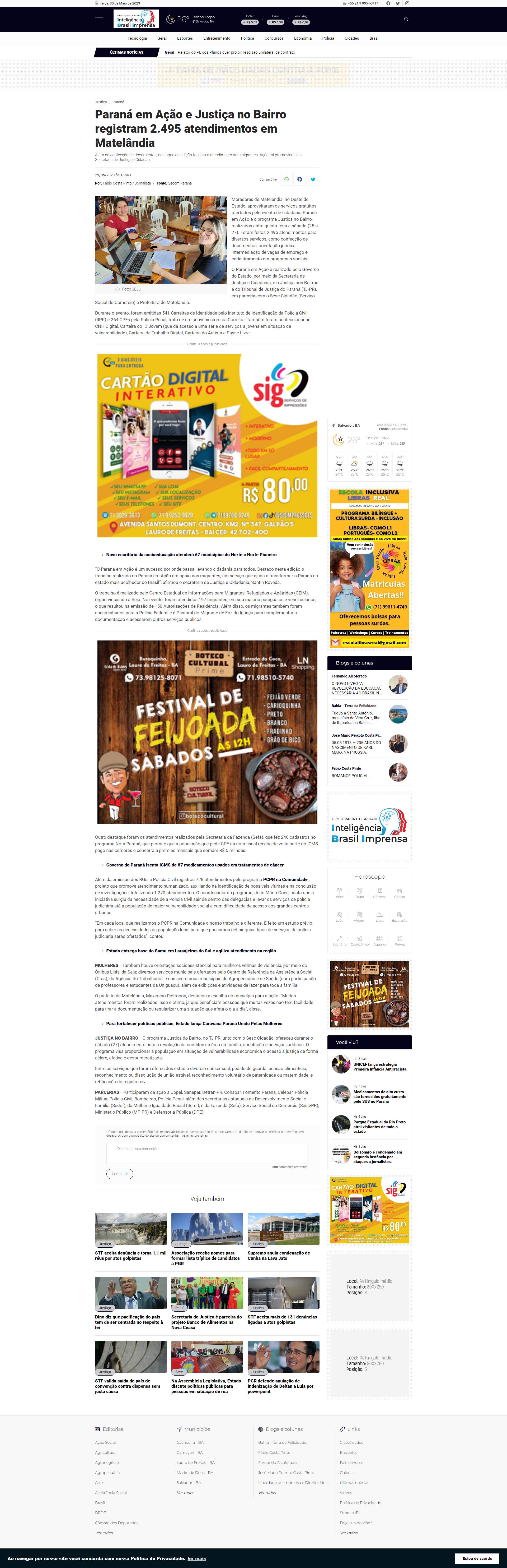 JUSTIÇA NO BAIRRO- O programa Justiça do Bairro, do TJ-PR junto com o Sesc Cidadão, ofereceu durante o sábado (27) atendimento para a resolução de conflitos na área da família, orientação e serviços jurídicos. O programa visa proporcionar à população em situação de vulnerabilidade econômica o acesso à justiça de forma célere, efetiva e desburocratizada.
