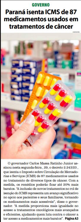 O governador Carlos Massa Ratinho Junior assinou nesta segunda-feira , 29, o decreto 2.243/23 , que isenta o Imposto sobre Circulação de Mercadorias e Serviços (ICMS) de 87 medicamentos usados no tratamento de diversos tipos de câncer. Com a medida, os remédios poderão ficar até 20% mais baratos. “A inclusão de novos tratamentos no rol de isenção do ICMS representa um avanço significativo no apoio aos pacientes e seus familiares, tornando os medicamentos mais acessíveis”, disse o governador. “A medida proporciona mais igualdade no acesso a tratamentos oncológicos mais avançados e eficientes, ajudando quem luta contra o câncer a ter acesso a medicamentos mais baratos”. Página A3