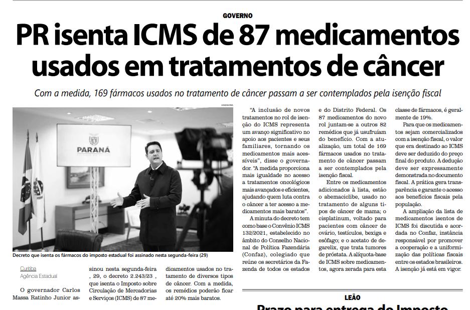 O governador Carlos Massa Ratinho Junior assinou nesta segunda-feira , 29, o decreto 2.243/23 , que isenta o Imposto sobre Circulação de Mercadorias e Serviços (ICMS) de 87 medicamentos usados no tratamento de diversos tipos de câncer. Com a medida, os remédios poderão ficar até 20% mais baratos.“A inclusão de novos tratamentos no rol de isenção do ICMS representa um avanço significativo no apoio aos pacientes e seus familiares, tornando os medicamentos mais acessíveis”, disse o governador. “A medida proporciona mais igualdade no acesso a tratamentos oncológicos mais avançados e eficientes, ajudando quem luta contra o câncer a ter acesso a medicamentos mais baratos”. A minuta do decreto tem como base o Convênio ICMS 132/2021, estabelecido no âmbito do Conselho Nacional de Política Fazendária (Confaz), colegiado que reúne os secretários da Fazenda de todos os estados e do Distrito Federal. Os 87 medicamentos do novo rol juntam-se a outros 82 remédios que já usufruíam do benefício. Com a atualização, um total de 169 fármacos usados no tratamento de câncer passam a ser contemplados pela isenção fiscal. Entre os medicamentos adicionados à lista, estão o abemaciclibe, usado no tratamento de alguns tipos de câncer de mama; o cisplatinum, voltado para pacientes com câncer de ovário, testículos, bexiga e esôfago; e o acetato de degarelix, que trata tumores de próstata. A alíquota-base de ICMS sobre medicamentos, agora zerada para esta classe de fármacos, é geralmente de 19%. Para que os medicamentos sejam comercializados com a isenção fiscal, o valor que era destinado ao ICMS deve ser deduzido do preço final do produto. A dedução deve ser expressamente demonstrada no documento fiscal. A prática gera transparência e garante o acesso aos benefícios fiscais pela população. A ampliação da lista de medicamentos isentos de ICMS foi discutida e acordada no Confaz, instância responsável por promover a cooperação e a uniformização das políticas fiscais entre os estados brasileiros. A isenção já está em vigor.