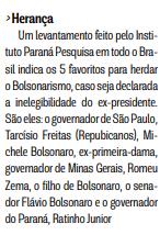 Um levantamento feito pelo Instituto Paraná Pesquisa em todo o Brasil indica os 5 favoritos para herdar o Bolsonarismo, caso seja declarada a inelegibilidade do ex-presidente. São eles: o governador de São Paulo, Tarcísio Freitas (Repubicanos), Michele Bolsonaro, ex-primeira-dama, governador de Minas Gerais, Romeu Zema, o filho de Bolsonaro, o senador Flávio Bolsonaro e o governador do Paraná, Ratinho Junior.