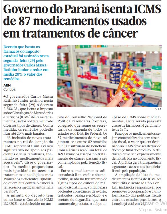 O governador Carlos Massa Ratinho Junior assinou nesta segunda-feira (29) o decreto 2.243/23 , que isenta o Imposto sobre Circulação de Mercadorias e Serviços (ICMS) de 87 medicamentos usados no tratamento de diversos tipos de câncer. Com a medida, os remédios poderão fi car até 20% mais baratos. “A inclusão de novos tratamentos no rol de isenção do ICMS representa um avanço significativo no apoio aos pacientes e seus familiares, tornando os medicamentos mais acessíveis”, disse o governador. “A medida proporciona mais igualdade no acesso a tratamentos oncológicos mais avançados e efi cientes, ajudando quem luta contra o câncer a ter acesso a medicamentos mais baratos”. A minuta do decreto tem como base o Convênio ICMS 132/2021, estabelecido no âmbito do Conselho Nacional de Política Fazendária (Confaz), colegiado que reúne os secretários da Fazenda de todos os estados e do Distrito Federal. Os 87 medicamentos do novo rol juntam-se a outros 82 remédios que já usufruíam do benefício. Com a atualização, um total de 169 fármacos usados no tratamento de câncer passam a ser contemplados pela isenção fi scal. Entre os medicamentos adicionados à lista, estão o abemaciclibe, usado no tratamento de alguns tipos de câncer de mama; o cisplatinum, voltado para pacientes com câncer de ovário, testículos, bexiga e esôfago; e o acetato de degarelix, que trata tumores de próstata. A alíquota- -base de ICMS sobre medicamentos, agora zerada para esta classe de fármacos, é geralmente de 19%. Para que os medicamentos sejam comercializados com a isenção fi scal, o valor que era destinado ao ICMS deve ser deduzido do preço fi nal do produto. A dedução deve ser expressamente demonstrada no documento fi scal. A prática gera transparência e garante o acesso aos benefícios fi scais pela população. A ampliação da lista de medicamentos isentos de ICMS foi discutida e acordada no Confaz, instância responsável por promover a cooperação e a uniformização das políticas fi scais entre os estados brasileiros. A isenção já está em vigor.