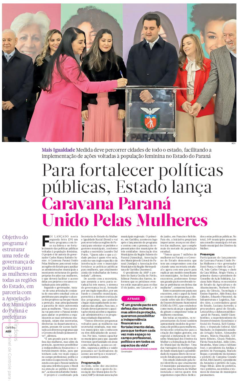 F OI LANÇADO nesta segunda-feira (29) um novo programa com foco na defesa e no fortalecimento das políticas públicas voltadas à população feminina. O projeto é de autoria do governador Carlos Massa Ratinho Junior. A Caravana Paraná Unido Pelas Mulheres percorrerá todas as regiões do Estado para auxiliar as administrações municipais a montarem estruturas de gestão próprias focadas nas mulheres, o que deverá facilitar o acesso delas aos projetos e recursos estaduais para este público. Segundo o governador, trata- -se de uma articulação conjunta do executivo estadual com as prefeituras para ampliar o alcance dos projetos e ações que visam a proteção, mas principalmente a garantia de mais autonomia para as mulheres. “Essa caravana vai percorrer o Paraná inteiro para ajudar os prefeitos a organizarem as suas estruturas municipais, sejam elas secretarias, diretorias ou departamentos e, assim, possam ter acesso facilitado aos diversos programas que o Governo do Estado já desenvolve”, afi rmou. “É um grande pacto em defesa das mulheres, mas além da proteção, queremos possibilitar a independência financeira e o fortalecimento delas, para que tenham cada vez mais espaço no campo profi ssional, político e em todos os aspectos da vida, fazendo com que o Paraná também seja uma referência para o Brasil na atenção ao público feminino”, acrescentou Ratinho Junior. O projeto é coordenado pela Secretaria de Estado da Mulher e Igualdade Racial (Semi) e vai percorrer todas as regiões do Paraná para orientar os prefeitos e gestores municipais, conforme explica a secretária Leandre Dal Ponte. “Quem sabe o que a cidade precisa é quem vive nela, então ter um órgão específi co de interlocução com o município fortalece as políticas públicas para mulheres, que atualmente ainda são trabalhadas de forma isolada”, afi rmou. De acordo com a secretária, que assumiu a nova pasta estadual há três meses, o sistema de governança local, formado por um órgão específi co, por um fundo e conselho municipais, permitirá a desburocratização dos programas, que poderão chegar mais rapidamente às moradoras das cidades. Para isso, o Estado deverá promover capacitações técnicas sobre a organização administrativa e os programas estaduais disponíveis. “Temos diversos programas voltados para as mulheres nas secretarias estaduais, mas muitos municípios não conhecem ou têm difi culdades de acessá- -los. Por isso, vamos capacitar os municípios para que. quando tivermos oportunidade em áreas como habitação, acesso ao crédito, segurança pública e saúde possamos ser facilitadores do acesso aos serviços e recursos”, complementou Leandre. Programação Ao todo, serão dez encontros realizados com o apoio da Associação dos Municípios do Paraná (AMP) e demais associaçõesmunicipais regionais. O primeiro, em Curitiba, aconteceu logo após o lançamento do programa e contou com a presença de representantes dos municípios de três entidades: Associação dos Municípios da Região Suleste do Paraná (Amsulep), Associação dos Municípios do Litoral do Paraná (Amlipa) e Associação dos Municípios da Região Metropolitana de Curitiba (Assomec). O presidente da AMP e prefeito de Santa Cecília do Pavão, Edimar Pereira dos Santos, informou que os próximos eventos estão marcados para os dias 15 de junho, em Cascavel, e 16de junho, em Francisco Beltrão. Para ele, a iniciativa propiciará importantes avanços em direitos das mulheres, que compõe mais de metade da população estadual. “Temos quase 7 milhões de mulheres no Paraná e o Governo do Estado demonstra que tem um compromisso com elas criando uma secretaria estadual e agora com esse pacto para replicar um modelo semelhante nos municípios. Ao fi nal destes encontros, poderemos firmar um grande pacto envolvendo todas as prefeituras em defesa das mulheres”, comentou Santos. Entre os assuntos em pauta nos encontros, está o papel da Semi no contexto do programa, a discussão sobre um dos Objetivos de Desenvolvimento Sustentável (ODS) da ONU, que estabelece como meta alcançar a igualdade de gênero e empoderar todas as mulheres e meninas. Em todas as reuniões, os representantes da Semi também apresentarão modelos de governança de política para mulheres, fornecerão orientações para a criação dos órgãos gestores, em especial a instauração do Conselho Municipal dos Direitos da Mulher e a formalização do Fundo Municipal da Mulher. Uma das vantagens da configuração do fundo municipal é a possibilidade de repasse direto de recursos do Estado para as prefeituras. Um estudo elaborado pela Semi identificou que atualmente 13 municípios paranaenses possuem uma Secretaria da Mulher instalada e outros quatro têm organismos específi cos dedicados a estas políticas públicas. No total, 149 municípios possuem um conselho municipal e 64 um fundo municipal dos Direitos da Mulher. Presenças Participaram do lançamento da Caravana Paraná Unido Pelas Mulheres o vice-governador Darci Piana; o chefe da Casa Civil, João Carlos Ortega; o chefe da Casa Militar, Sérgio Vieira; a primeira-dama e presidente do Conselho de Ação Solidária, Luciana Saito Massa; os secretários de Estado da Agricultura e do Abastecimento, Norberto Ortigara; da Ciência, Tecnologia e Ensino Superior, Aldo Bona; das Cidades, Eduardo Pimentel; da Infraestrutura e Logística, Sandro Alex; a controladora-geral do Estado, Luciana Azevedo; a procuradora-geral do Estado, Letícia Silva; o defensor público- -geral do Paraná, André Giamberdino; a superintendente de Desenvolvimento Econômico e Social do Paraná, Keli Guimarães; o deputado federal Aliel Machado; os deputados estaduais Artagão Junior, Alexandre Amaro, Márcia Huçulak, Gilberto Ribeiro, Cloara Pinheiro, Flávia Francischini, Adão Litro, Batatinha, Mara Lima e Adriano José; o presidente da Amlipa e prefeito de Paranaguá, Marcelo Roque; o p