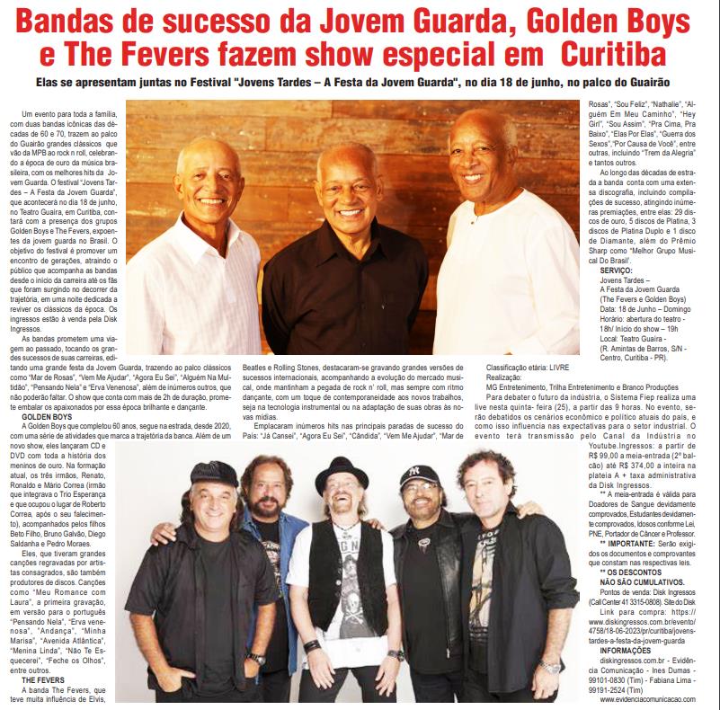 Um evento para toda a família, com duas bandas icônicas das décadas de 60 e 70, trazem ao palco do Guairão grandes clássicos que vão da MPB ao rock n roll, celebrando a época de ouro da música brasileira, com os melhores hits da Jovem Guarda. O festival “Jovens Tardes – A Festa da Jovem Guarda”, que acontecerá no dia 18 de junho, no Teatro Guaíra, em Curitiba, contará com a presença dos grupos Golden Boys e The Fevers, expoentes da jovem guarda no Brasil. O objetivo do festival é promover um encontro de gerações, atraindo o público que acompanha as bandas desde o início da carreira até os fãs que foram surgindo no decorrer da trajetória, em uma noite dedicada a reviver os clássicos da época. Os ingressos estão à venda pela Disk Ingressos. As bandas prometem uma viagem ao passado, tocando os grandes sucessos de suas carreiras, editando uma grande festa da Jovem Guarda, trazendo ao palco clássicos como “Mar de Rosas”, “Vem Me Ajudar”, “Agora Eu Sei”, “Alguém Na Multidão”, “Pensando Nela” e “Erva Venenosa”, além de inúmeros outros, que não poderão faltar. O show que conta com mais de 2h de duração, promete embalar os apaixonados por essa época brilhante e dançante. GOLDEN BOYS A Golden Boys que completou 60 anos, segue na estrada, desde 2020, com uma série de atividades que marca a trajetória da banca. Além de um novo show, eles lançaram CD e DVD com toda a história dos meninos de ouro. Na formação atual, os três irmãos, Renato, Ronaldo e Mário Correa (irmão que integrava o Trio Esperança e que ocupou o lugar de Roberto Correa, após o seu falecimento), acompanhados pelos filhos Beto Filho, Bruno Galvão, Diego Saldanha e Pedro Moraes. Eles, que tiveram grandes canções regravadas por artistas consagrados, são também produtores de discos. Canções como “Meu Romance com Laura”, a primeira gravação, em versão para o português “Pensando Nela”, “Erva venenosa”, ”Andança”, “Minha Marisa”, “Avenida Atlântica”, “Menina Linda”, “Não Te Esquecerei”, “Feche os Olhos”, entre outros. THE FEVERS A banda The Fevers, que teve muita influência de Elvis,Beatles e Rolling Stones, destacaram-se gravando grandes versões de sucessos internacionais, acompanhando a evolução do mercado musical, onde mantinham a pegada de rock n’ roll, mas sempre com ritmo dançante, com um toque de contemporaneidade aos novos trabalhos, seja na tecnologia instrumental ou na adaptação de suas obras às novas mídias. Emplacaram inúmeros hits nas principais paradas de sucesso do País: “Já Cansei”, “Agora Eu Sei”, “Cândida”, “Vem Me Ajudar”, “Mar deRosas”, “Sou Feliz”, “Nathalie”, “Alguém Em Meu Caminho”, “Hey Girl”, “Sou Assim”, “Pra Cima, Pra Baixo”, “Elas Por Elas”, “Guerra dos Sexos”,“Por Causa de Você”, entre outras, incluindo “Trem da Alegria” e tantos outros. Ao longo das décadas de estrada a banda conta com uma extensa discografia, incluindo compilações de sucesso, atingindo inúmeras premiações, entre elas: 29 discos de ouro, 5 discos de Platina, 3 discos de Platina Duplo e 1 disco de Diamante, além do Prêmio Sharp como “Melhor Grupo Musical Do Brasil’. SERVIÇO: Jovens Tardes – A Festa da Jovem Guarda (The Fevers e Golden Boys) Data: 18 de Junho – Domingo Horário: abertura do teatro - 18h/ Início do show – 19h Local: Teatro Guaíra - (R. Amintas de Barros, S/N - Centro, Curitiba - PR). Classificação etária: LIVRE Realização: MG Entretenimento, Trilha Entretenimento e Branco Produções Para debater o futuro da indústria, o Sistema Fiep realiza uma live nesta quinta- feira (25), a partir das 9 horas. No evento, serão debatidos os cenários econômico e político atuais do país, e como isso influencia nas expectativas para o setor industrial. O evento terá transmissão pelo Canal da Indústria no Youtube.Ingressos: a partir de R$ 99,00 a meia-entrada (2º balcão) até R$ 374,00 a inteira na plateia A + taxa administrativa da Disk Ingressos. ** A meia-entrada é válida para Doadores de Sangue devidamente comprovados, Estudantes devidamente comprovados, Idosos conforme Lei, PNE, Portador de Câncer e Professor. ** IMPORTANTE: Serão exigidos os documentos e comprovantes que constam nas respectivas leis. ** OS DESCONTOS NÃO SÃO CUMULATIVOS. Pontos de venda: Disk Ingressos (Call Center 41 3315-0808). Site do Disk Link para compra: https:// www.diskingressos.com.br/evento/ 4758/18-06-2023/pr/curitiba/jovenstardes-a-festa-da-jovem-guarda INFORMAÇÕES diskingressos.com.br - Evidência Comunicação - Ines Dumas - 99101-0830 (Tim) - Fabiana Lima - 99191-2524 (Tim) www.evidenciacomunicacao.com