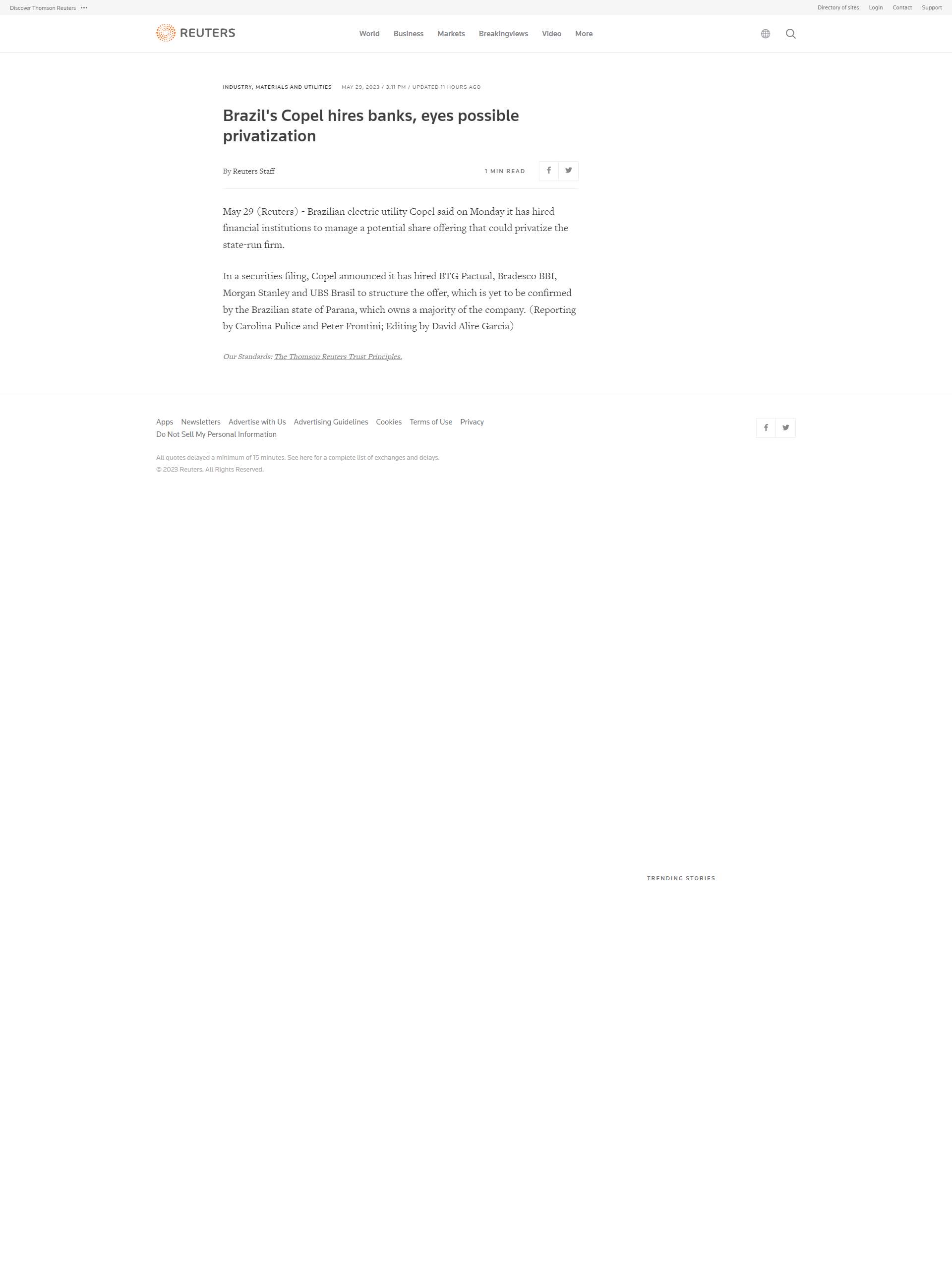 Copel announced it has hired BTG Pactual, Bradesco BBI, Morgan Stanley and UBS Brasil to structure the offer, which is yet to be confirmed by the Brazilian state of Parana, which owns a majority of the company. (Reporting by Carolina Pulice and Peter Frontini; Editing by David Alire Garcia)