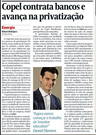Copel. Mesmo com tantas etapas, Slaviero prevê que tudo deverá se concluir até outubro deste ano.