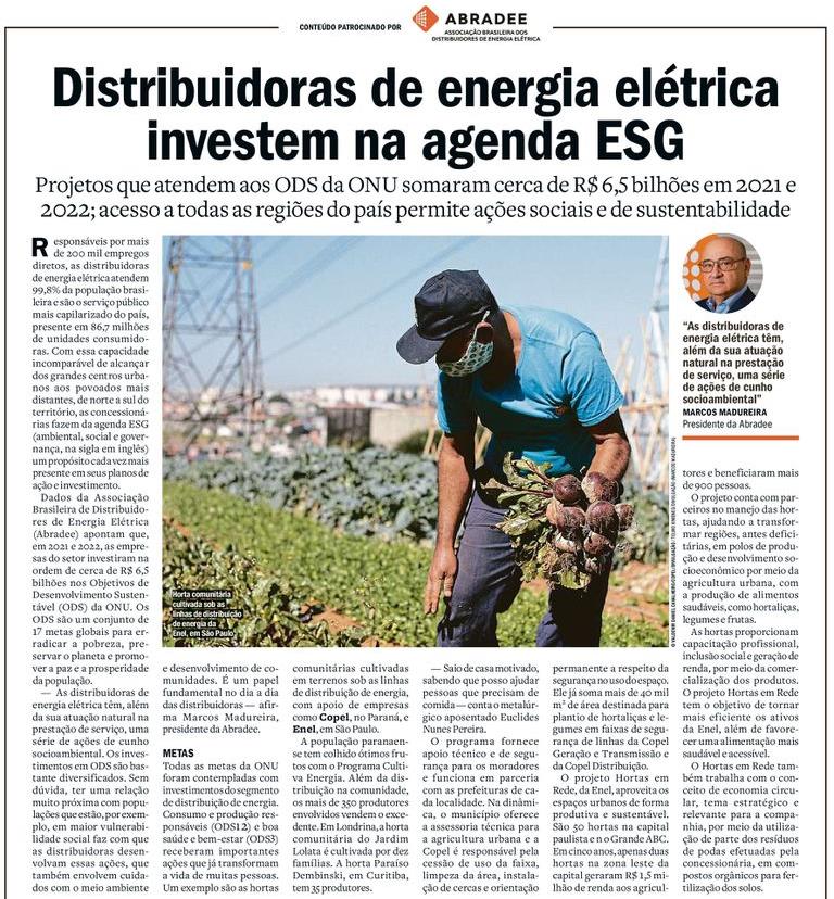 Dados da Associação Brasileira de Distribuidores de Energia Elétrica (Abradee) apontam que, em 2021 e 2022, as empresas do setor investiram na ordem de cerca de R$ 6, 5 bilhões nos Objetivos de Desenvolvimento Sustentável (ODS) da ONU. Os ODS são um conjunto de 17 metas globais para erradicar a pobreza, preservar o planeta e promover a paz e a prosperidade da população.