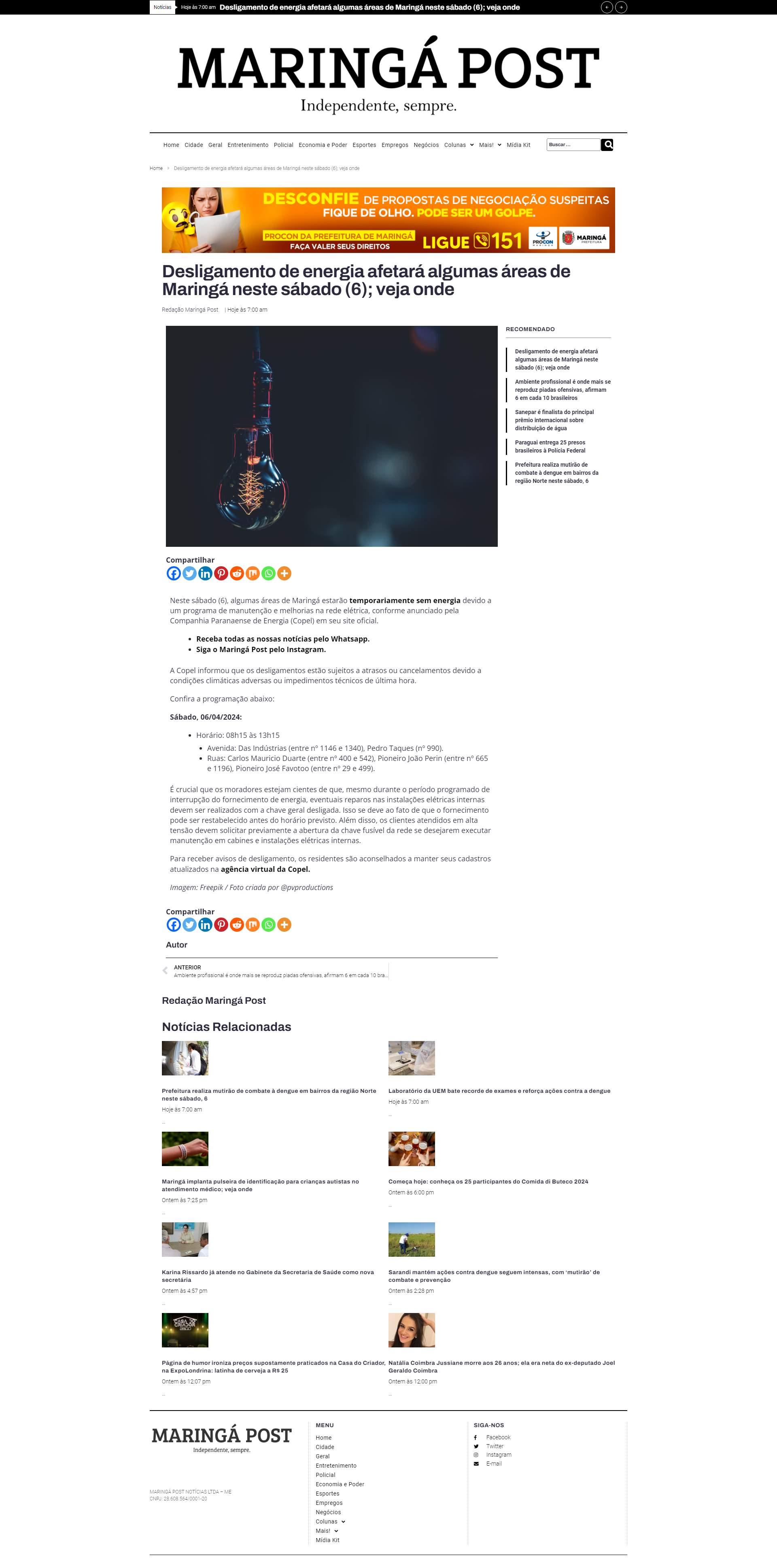 Neste sábado (6), algumas áreas de Maringá estarão temporariamente sem energia devido a um programa de manutenção e melhorias na rede elétrica, conforme anunciado pela