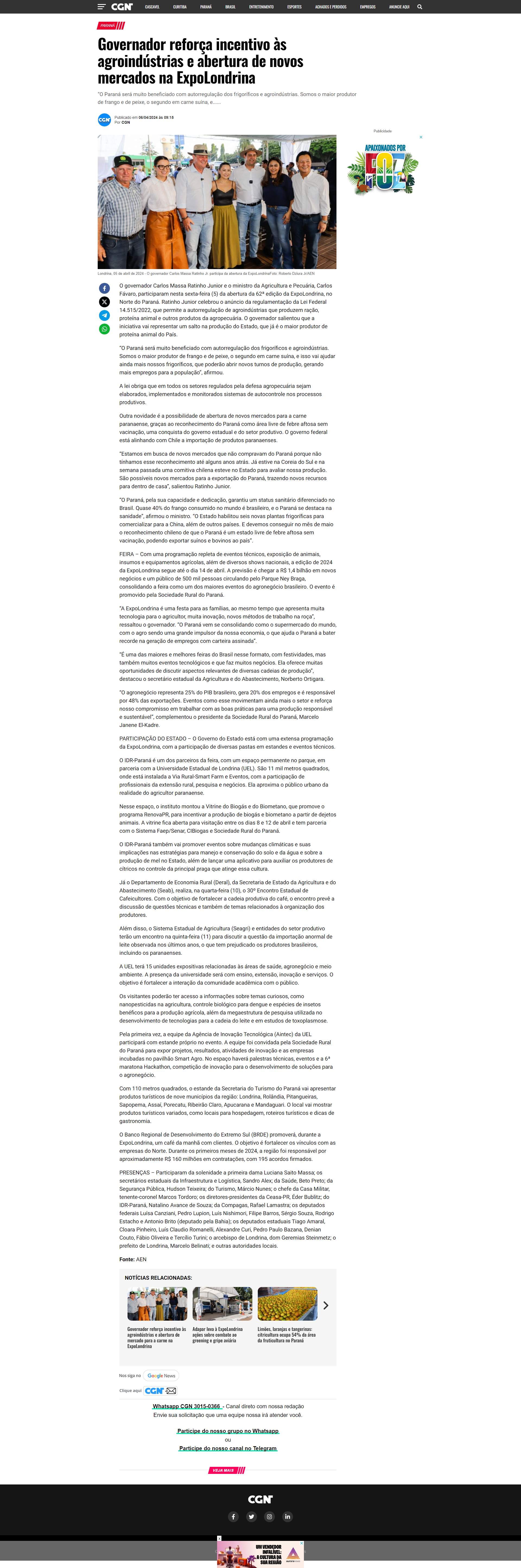 “A ExpoLondrina é uma festa para as famílias, ao mesmo tempo que apresenta muita tecnologia para o agricultor, muita inovação, novos métodos de trabalho na roça”, ressaltou o governador. “O Paraná vem se consolidando como o supermercado do mundo, com o agro sendo uma grande impulsor da nossa economia, o que ajuda o Paraná a bater recorde na geração de empregos com carteira assinada”.