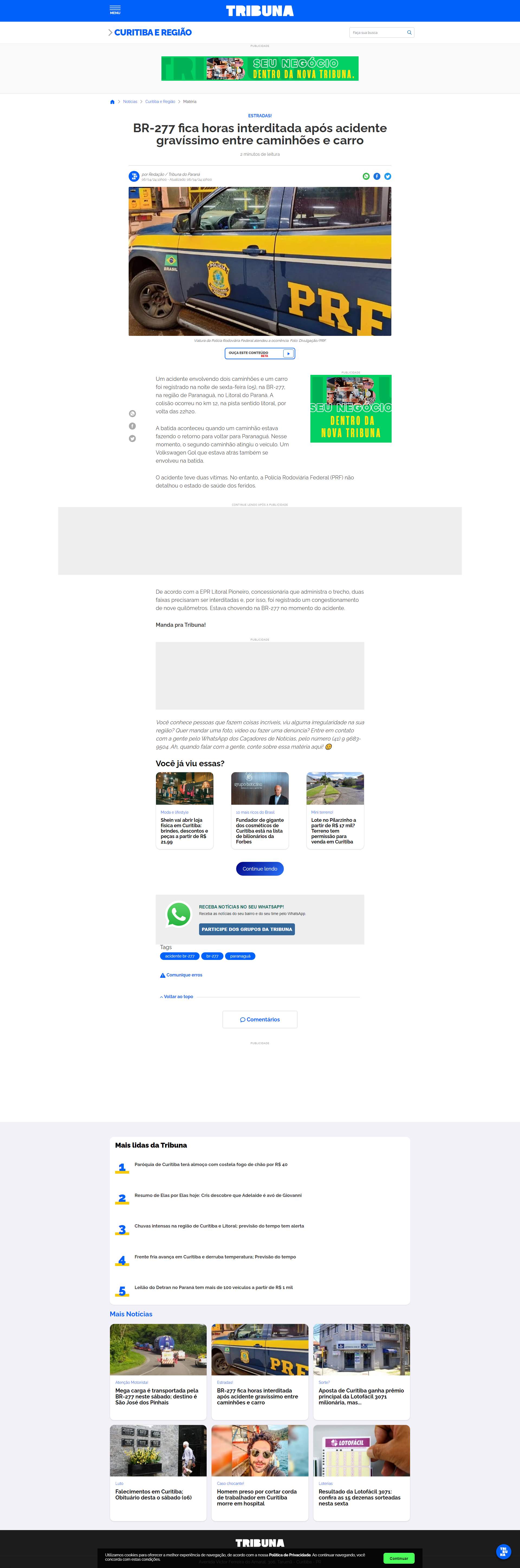 EPR Litoral Pioneiro, concessionária que administra o trecho, duas faixas precisaram ser interditadas e, por isso, foi registrado um congestionamento de nove quilômetros. Estava chovendo na BR-277 no momento do acidente.