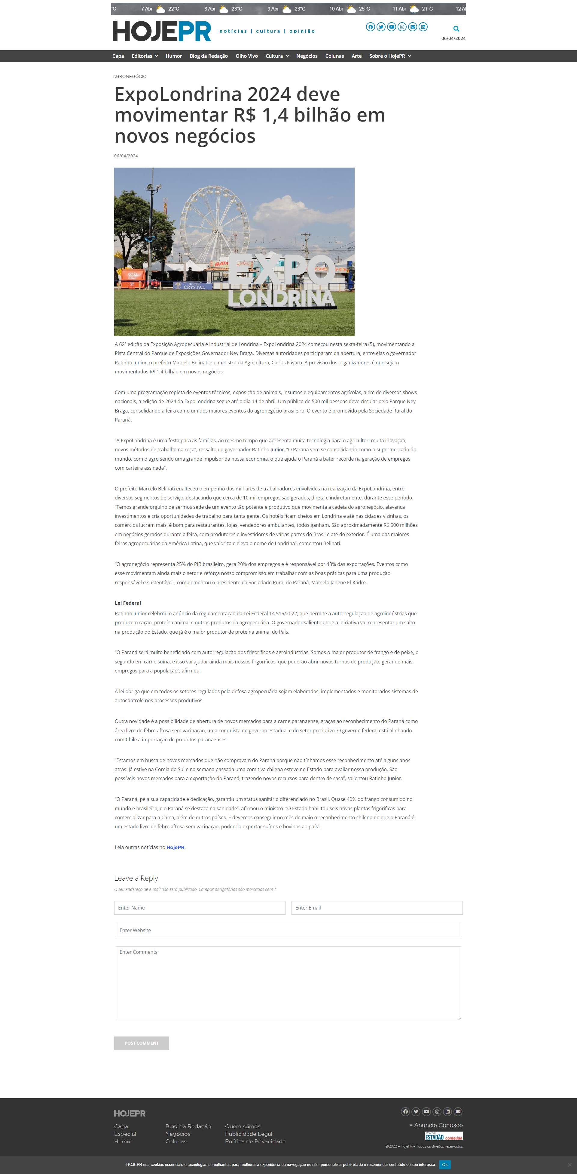Com uma programação repleta de eventos técnicos, exposição de animais, insumos e equipamentos agrícolas, além de diversos shows nacionais, a edição de 2024 da ExpoLondrina segue até o dia 14 de abril. Um público de 500 mil pessoas deve circular pelo Parque Ney Braga, consolidando a feira como um dos maiores eventos do agronegócio brasileiro. O evento é promovido pela Sociedade Rural do
