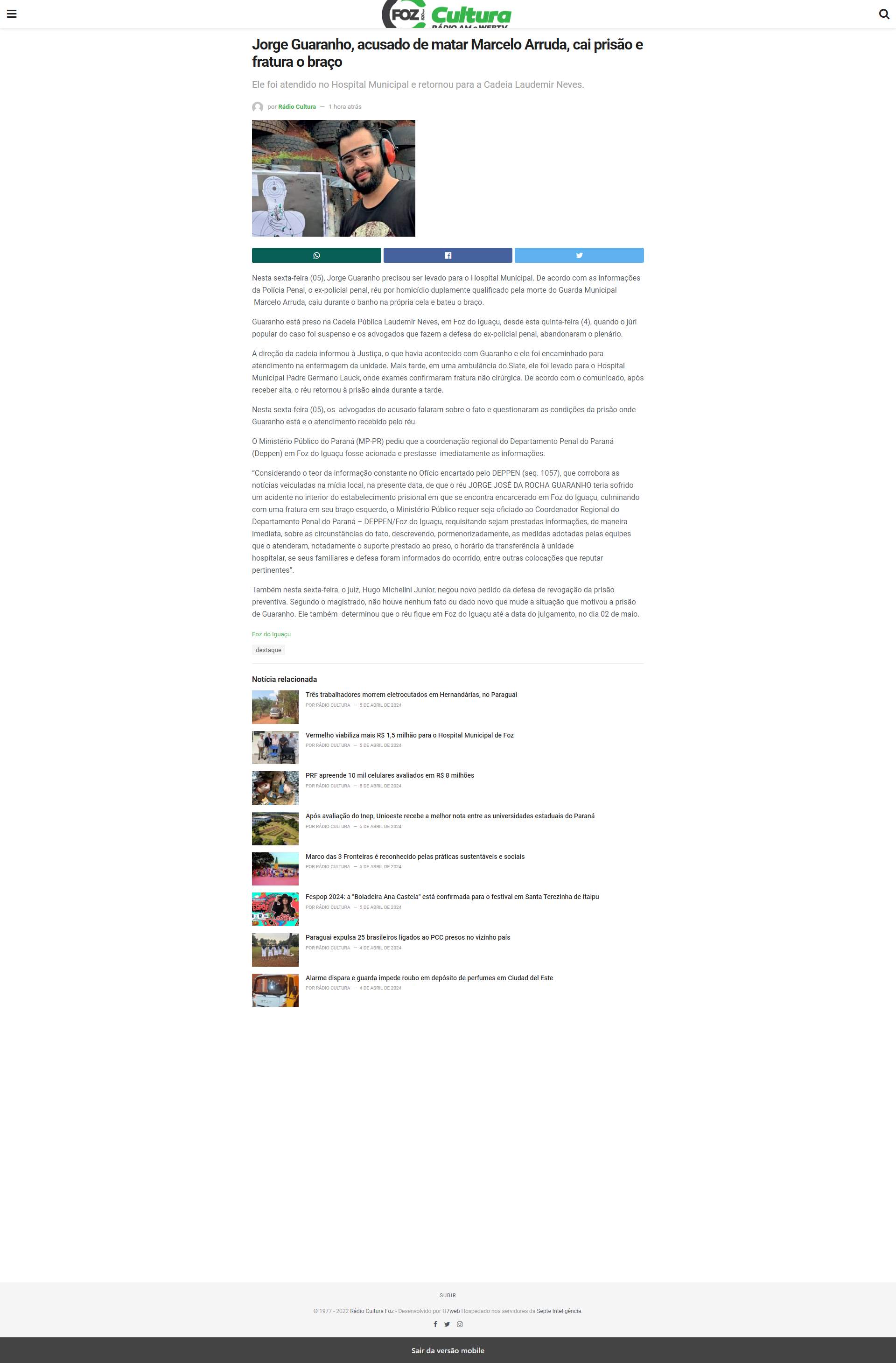 Marcelo Arruda, cai prisão e fratura o braço Ele foi atendido no Hospital Municipal e retornou para a Cadeia Laudemir Neves. por Rádio Cultura 2 minutos atrás