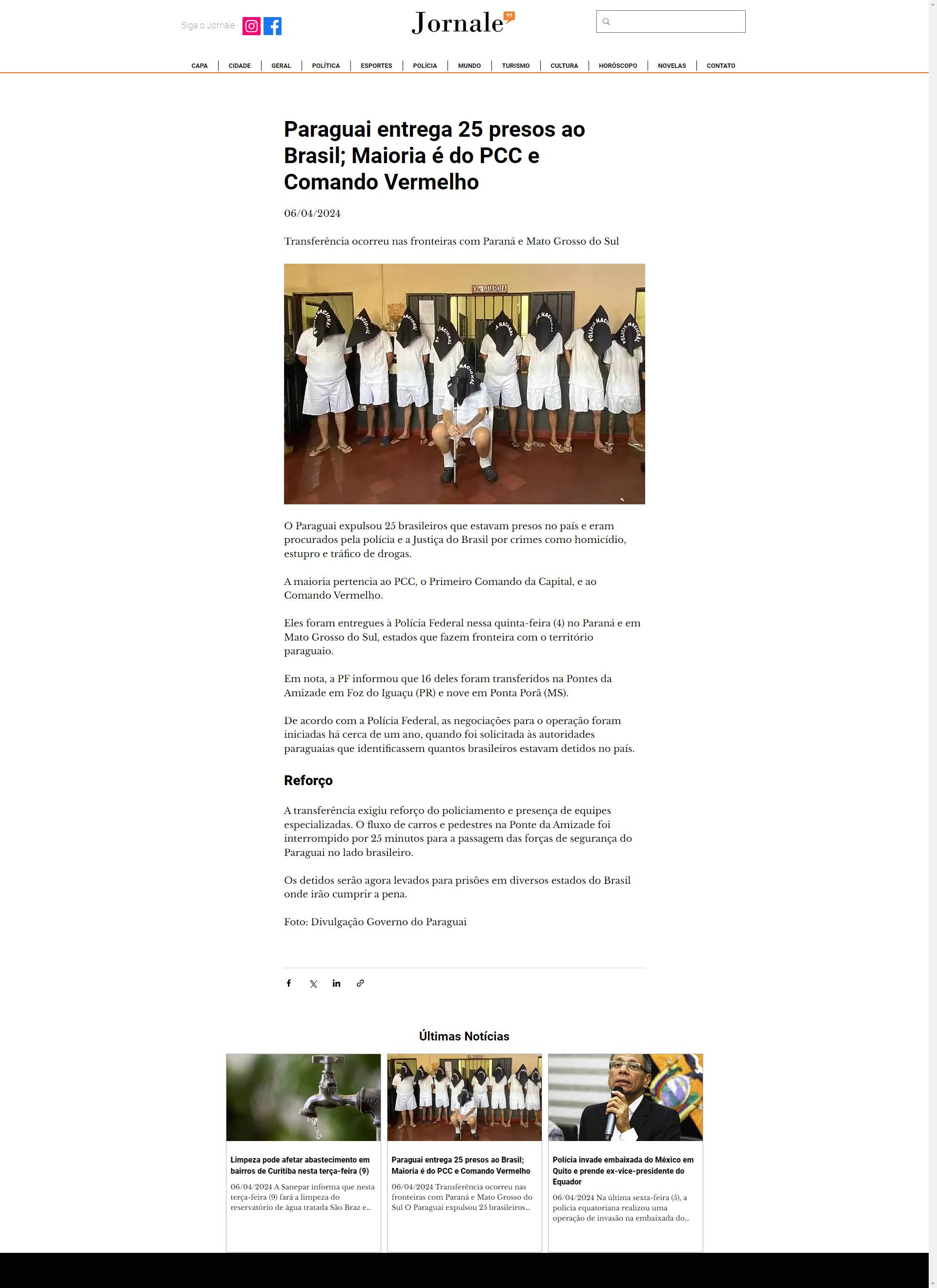06/04/202406/04/2024Transferência ocorreu nas fronteiras com Paraná e Mato Grosso do SulTransferência ocorreu nas fronteiras com Paraná e Mato Grosso do SulO Paraguai expulsou 25 brasileiros que estavam presos no país e eram procurados pela polícia e a Justiça do Brasil por crimes como homicídio, estupro e tráfico de drogas. O Paraguai expulsou 25 brasileiros que estavam presos no país e eram procurados pela polícia e a Justiça do Brasil por crimes como homicídio, estupro e tráfico de drogas. A maioria pertencia ao PCC, o Primeiro Comando da Capital, e ao Comando Vermelho.A maioria pertencia ao PCC, o Primeiro Comando da Capital, e ao Comando Vermelho.Eles foram entregues à Polícia Federal nessa quinta-feira (4) no Paraná e em Mato Grosso do Sul, estados que fazem fronteira com o território paraguaio. Eles foram entregues à Polícia Federal nessa quinta-feira (4) no Paraná e em Mato Grosso do Sul, estados que fazem fronteira com o território paraguaio. Em nota, a PF informou que 16 deles foram transferidos na Pontes da Amizade em Foz do Iguaçu (PR) e nove em Ponta Porã (MS). Em nota, a PF informou que 16 deles foram transferidos na Pontes da Amizade em Foz do Iguaçu (PR) e nove em Ponta Porã (MS). De acordo com a Polícia Federal, as negociações para o operação foram iniciadas há cerca de um ano, quando foi solicitada às autoridades paraguaias que identificassem quantos brasileiros estavam detidos no país.De acordo com a Polícia Federal, as negociações para o operação foram iniciadas há cerca de um ano, quando foi solicitada às autoridades paraguaias que identificassem quantos brasileiros estavam detidos no país.Reforço Reforço A transferência exigiu reforço do policiamento e presença de equipes especializadas. O fluxo de carros e pedestres na Ponte da Amizade foi interrompido por 25 minutos para a passagem das forças de segurança do Paraguai no lado brasileiro.A transferência exigiu reforço do policiamento e presença de equipes especializadas. O fluxo de carros e pedestres na Ponte da Amizade foi interrompido por 25 minutos para a passagem das forças de segurança do Paraguai no lado brasileiro.Os detidos serão agora levados para prisões em diversos estados do Brasil onde irão cumprir a pena. Os detidos serão agora levados para prisões em diversos estados do Brasil onde irão cumprir a pena. Foto: Divulgação Governo do ParaguaiFoto: Divulgação Governo do Paraguai