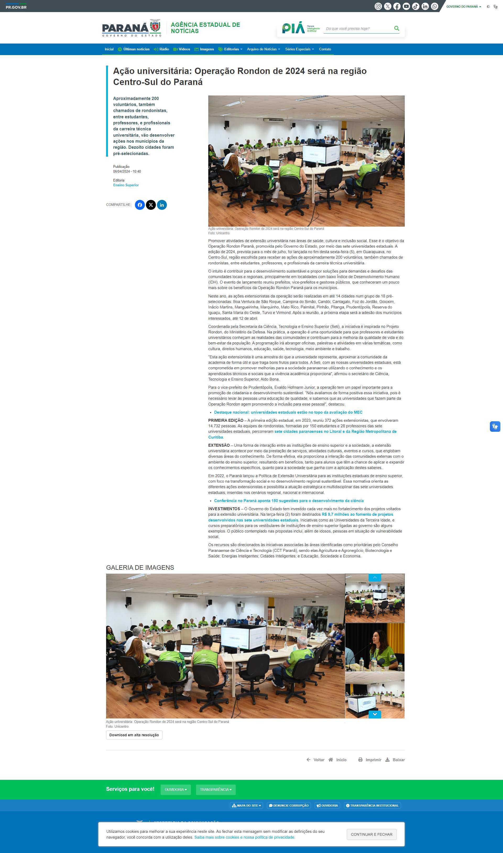 Governo do Estado, por meio das sete universidades estaduais. A edição de 2024, prevista para o mês de julho, foi lançada no fim desta sexta-feira (5), em Guarapuava, no Centro-Sul, região escolhida para receber as ações de aproximadamente 200 voluntários, também chamados de rondonistas, entre estudantes, professores, e profissionais da carreira técnica universitária.