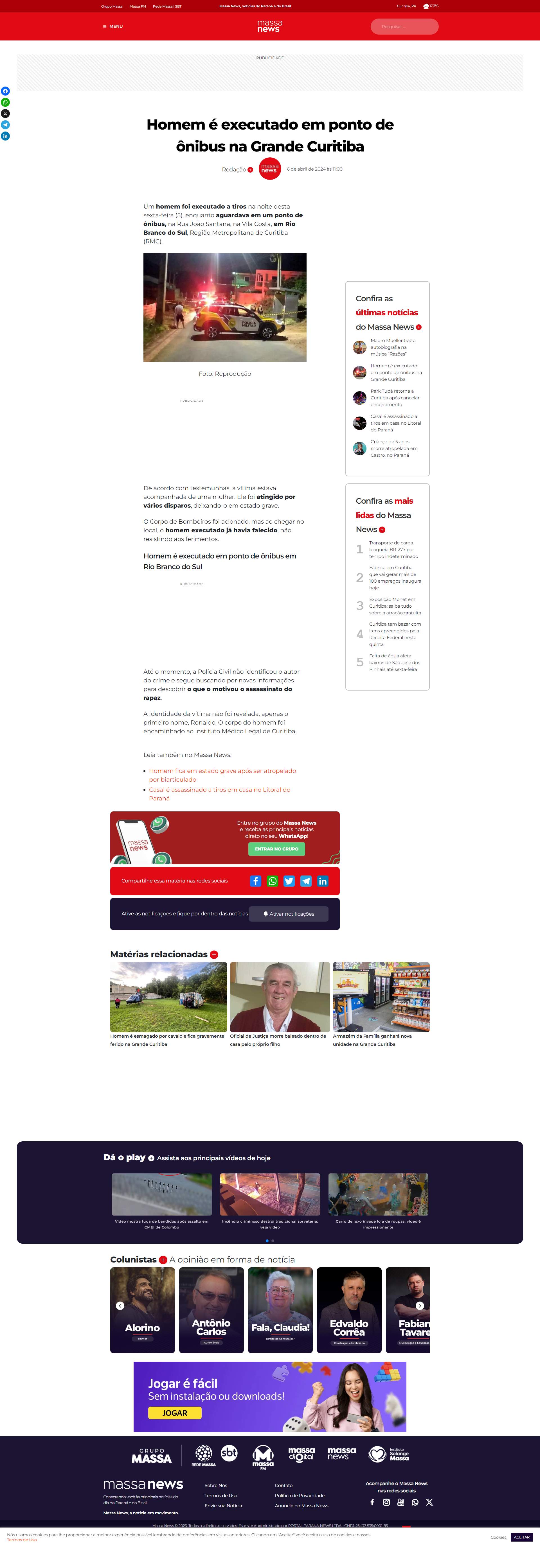 Um homem foi executado a tiros na noite desta sexta-feira (5), enquanto aguardava em um ponto de ônibus, na Rua João Santana, na Vila Costa, em Rio Branco do Sul, Região Metropolitana de Curitiba (RMC).
