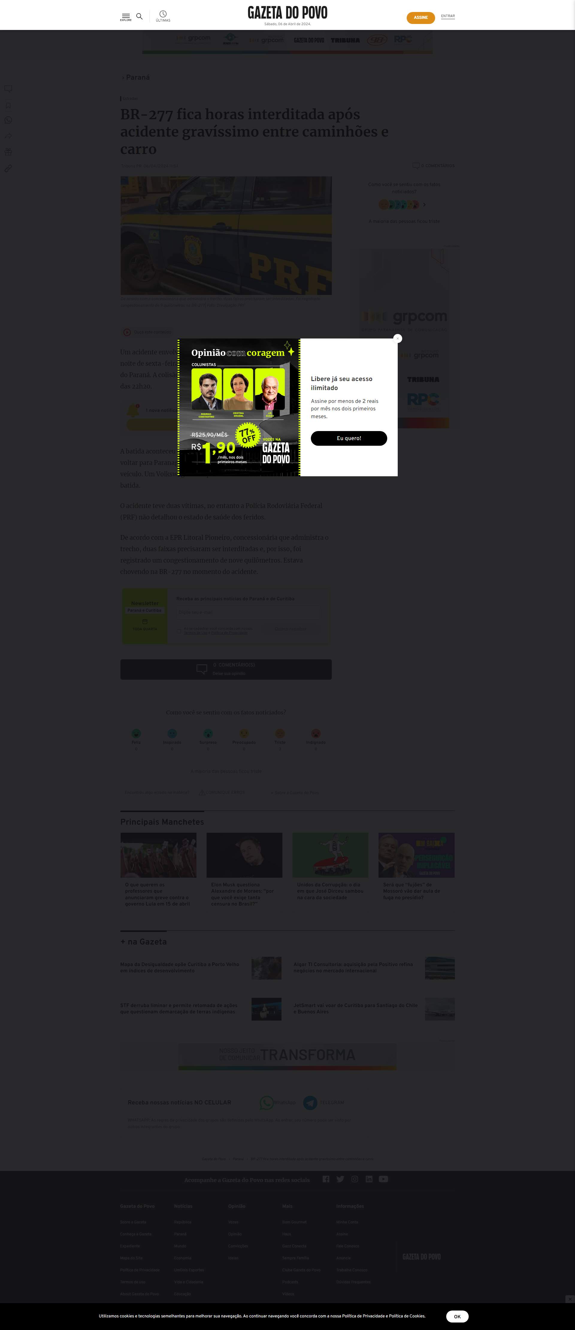 EPR Litoral Pioneiro, concessionária que administra o trecho, duas faixas precisaram ser interditadas e, por isso, foi registrado um congestionamento de nove quilômetros. Estava chovendo na BR-277 no momento do acidente.