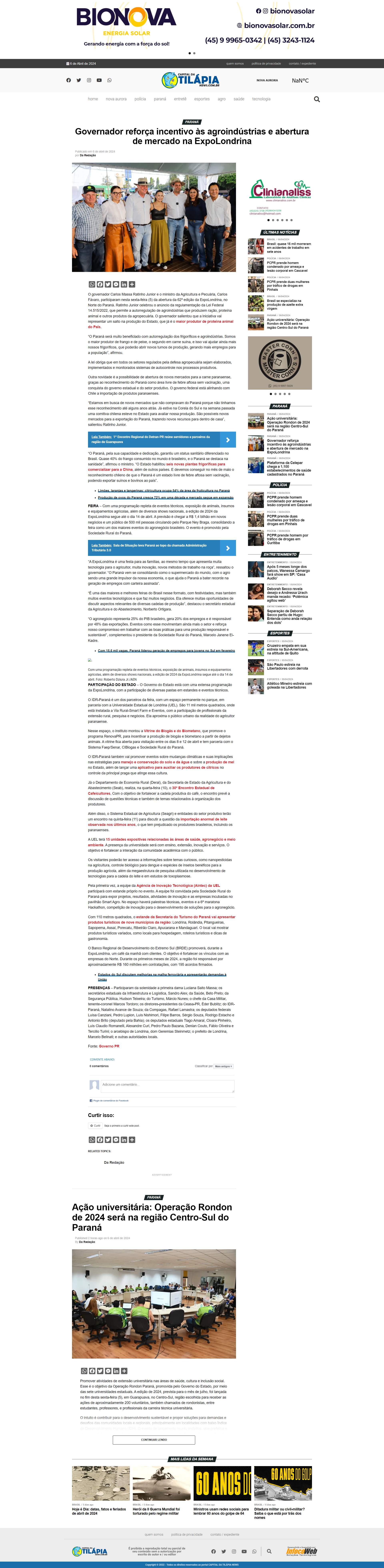 Londrina segue até o dia 14 de abril. A previsão é chegar a R$ 1,4 bilhão em novos negócios e um público de 500 mil pessoas circulando pelo Parque Ney Braga, consolidando a feira como um dos maiores eventos do agronegócio brasileiro. O evento é promovido pela Sociedade Rural do
