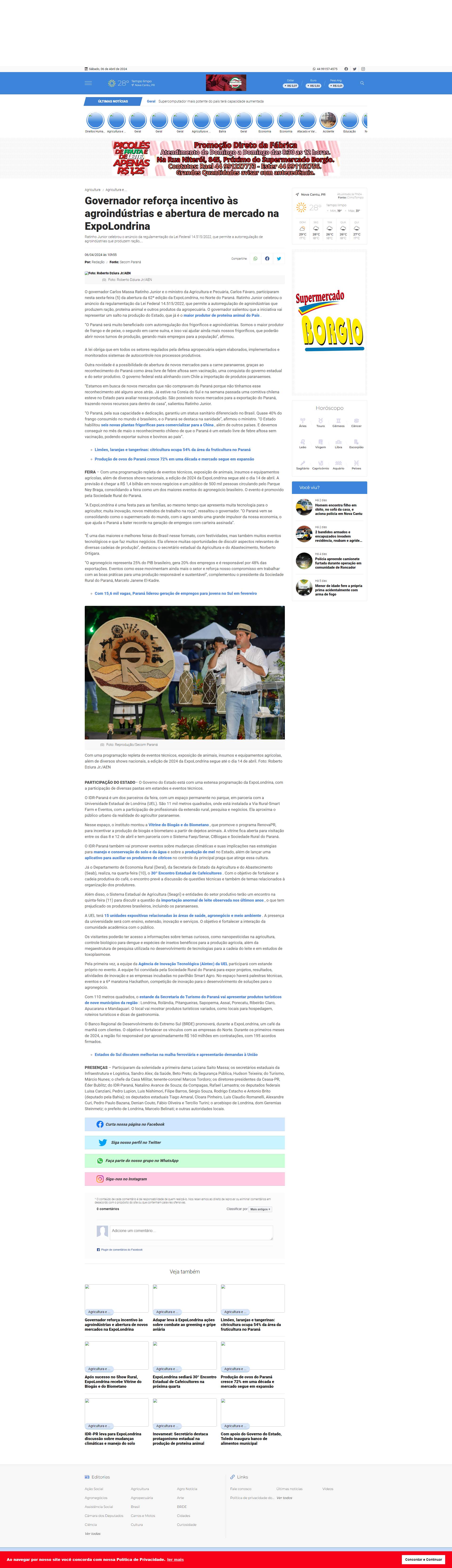 Londrina segue até o dia 14 de abril. A previsão é chegar a R$ 1,4 bilhão em novos negócios e um público de 500 mil pessoas circulando pelo Parque Ney Braga, consolidando a feira como um dos maiores eventos do agronegócio brasileiro. O evento é promovido pela Sociedade Rural do
