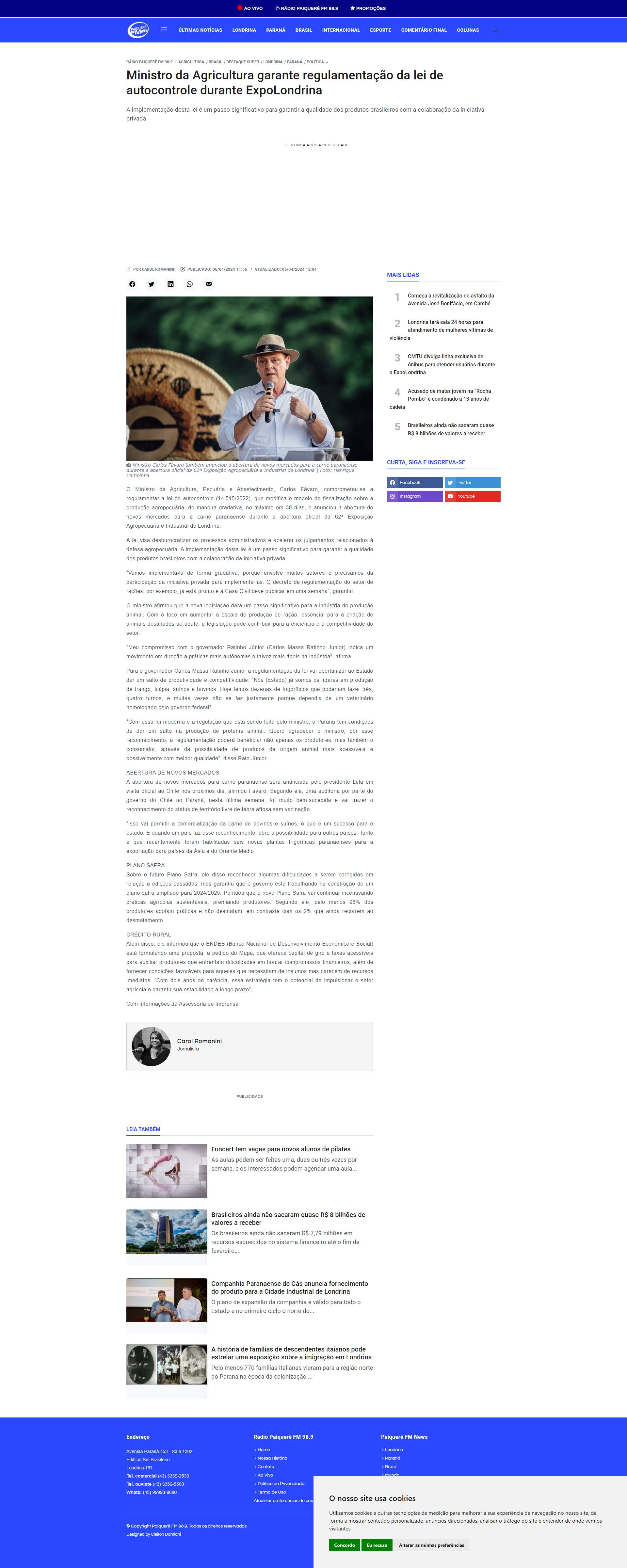O Ministro da Agricultura, Pecuária e Abastecimento, Carlos Fávaro, comprometeu-se a regulamentar a lei de autocontrole (14.515/2022), que modifica o modelo de fiscalização sobre a produção agropecuária, de maneira gradativa, no máximo em 30 dias, e anunciou a abertura de novos mercados para a carne paranaense durante a abertura oficial da 62ª Exposição Agropecuária e Industrial de Londrina.