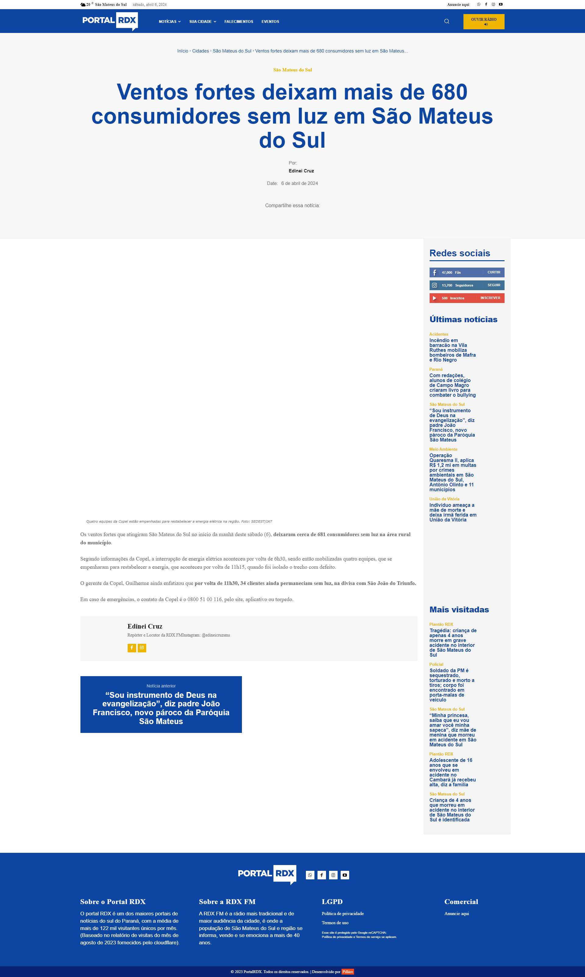 Copel, a interrupção de energia elétrica aconteceu por volta de 6h30, sendo então mobilizadas quatro equipes, que se empenharam para restabelecer a energia, que aconteceu por volta de 11h15, quando foi isolado o trecho com defeito.