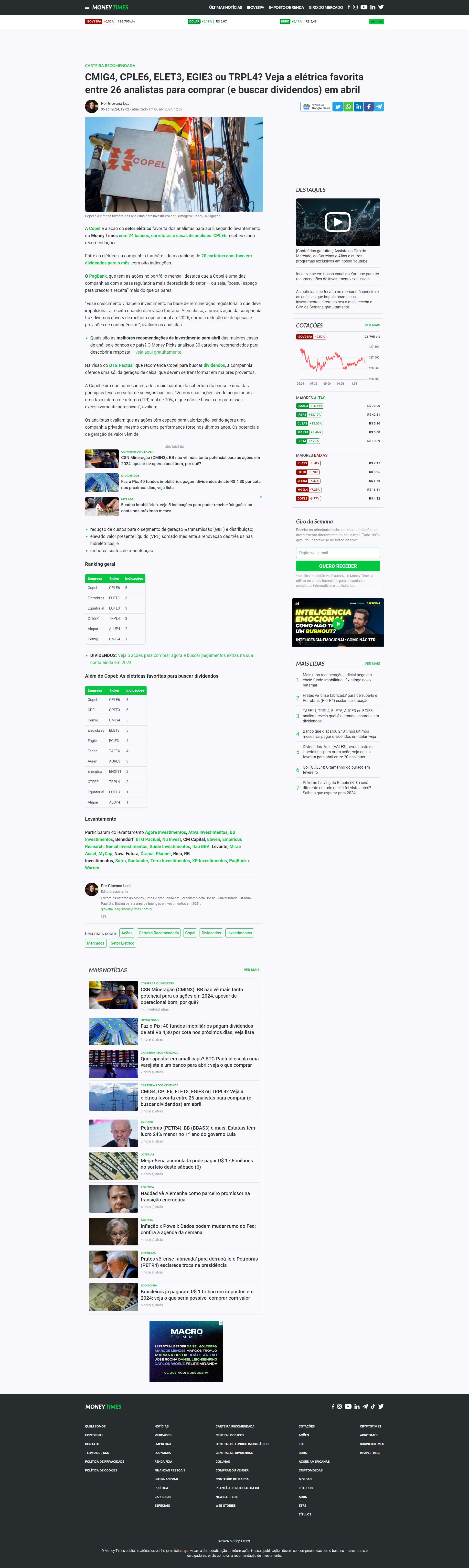 Copel é a ação do setor elétrico favorita dos analistas para abril, segundo levantamento do Money Times com 24 bancos, corretoras e casas de análises. CPLE6 recebeu cinco recomendações.