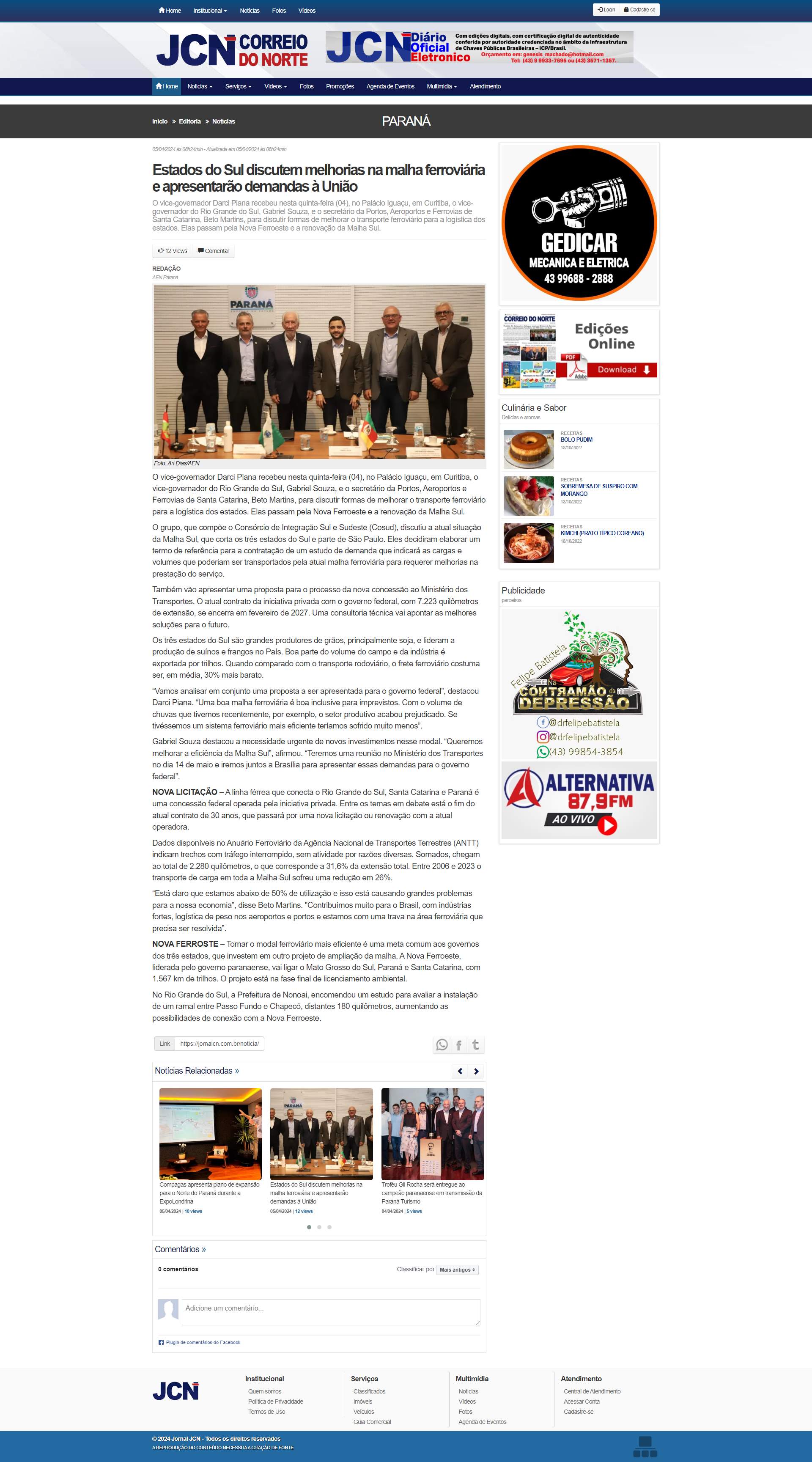 Darci Piana. “Uma boa malha ferroviária é boa inclusive para imprevistos. Com o volume de chuvas que tivemos recentemente, por exemplo, o setor produtivo acabou prejudicado. Se tivéssemos um sistema ferroviário mais eficiente teríamos sofrido muito menos”. Gabriel Souza destacou a necessidade urgente de novos investimentos nesse modal. “Queremos melhorar a eficiência da Malha Sul”, afirmou. “Teremos uma reunião no Ministério dos Transportes no dia 14 de maio e iremos juntos a Brasília para apresentar essas demandas para o governo federal”. NOVA LICITAÇÃO - A linha férrea que conecta o Rio Grande do Sul, Santa Catarina e Paraná é uma concessão federal operada pela iniciativa privada. Entre os temas em debate está o fim do atual contrato de 30 anos, que passará por uma nova licitação ou renovação com a atual operadora. Dados disponíveis no Anuário Ferroviário da Agência Nacional de Transportes Terrestres (ANTT) indicam trechos com tráfego interrompido, sem atividade por razões diversas. Somados, chegam ao total de 2.280 quilômetros, o que corresponde a 31,6% da extensão total. Entre 2006 e 2023 o transporte de carga em toda a Malha Sul sofreu uma redução em 26%. “Está claro que estamos abaixo de 50% de utilização e isso está causando grandes problemas para a nossa economia”, disse Beto Martins. "Contribuímos muito para o Brasil, com indústrias fortes, logística de peso nos aeroportos e portos e estamos com uma trava na área ferroviária que precisa ser resolvida”. NOVA FERROSTE - Tornar o modal ferroviário mais eficiente é uma meta comum aos governos dos três estados, que investem em outro projeto de ampliação da malha. A