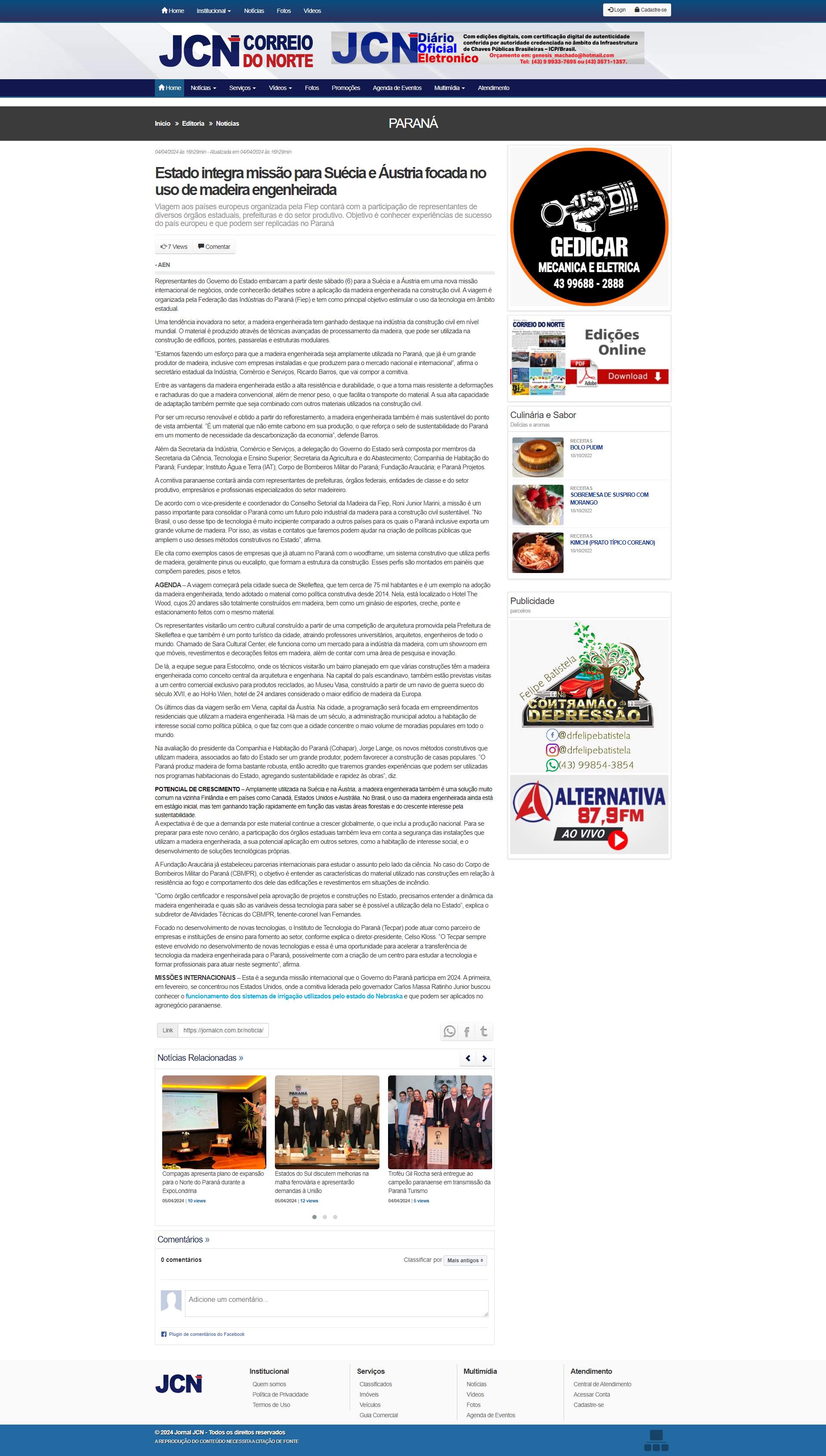 Paraná com o woodframe, um sistema construtivo que utiliza perfis de madeira, geralmente pinus ou eucalipto, que formam a estrutura da construção. Esses perfis são montados em painéis que compõem paredes, pisos e tetos. AGENDA - A viagem começará pela cidade sueca de Skelleftea, que tem cerca de 75 mil habitantes e é um exemplo na adoção da madeira engenheirada, tendo adotado o material como política construtiva desde 2014. Nela, está localizado o Hotel The Wood, cujos 20 andares são totalmente construídos em madeira, bem como um ginásio de esportes, creche, ponte e estacionamento feitos com o mesmo material. Os representantes visitarão um centro cultural construído a partir de uma competição de arquitetura promovida pela
