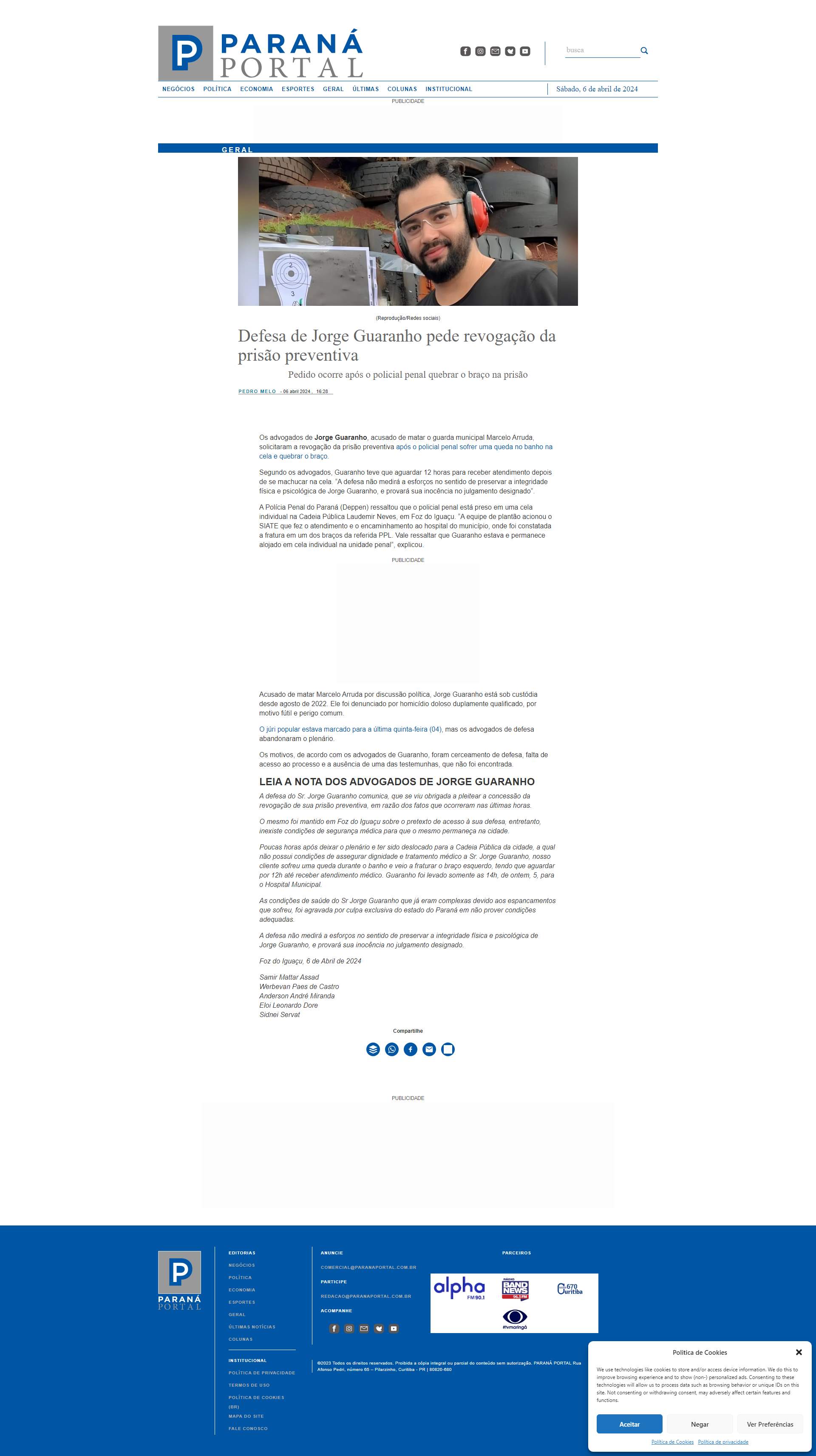Guaranho teve que aguardar 12 horas para receber atendimento depois de se machucar na cela. “A defesa não medirá a esforços no sentido de preservar a integridade física e psicológica de Jorge