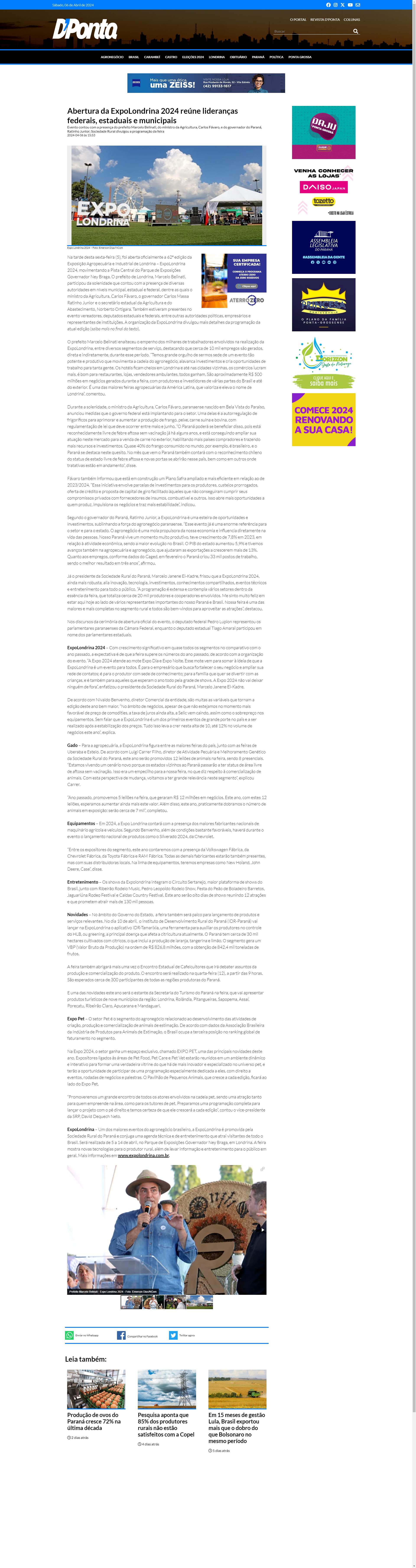 deputados estaduais e federais, entre outras autoridades políticas, empresários e representantes de instituições. A organização da ExpoLondrina divulgou mais detalhes da programação da atual edição (saiba mais no final do texto).