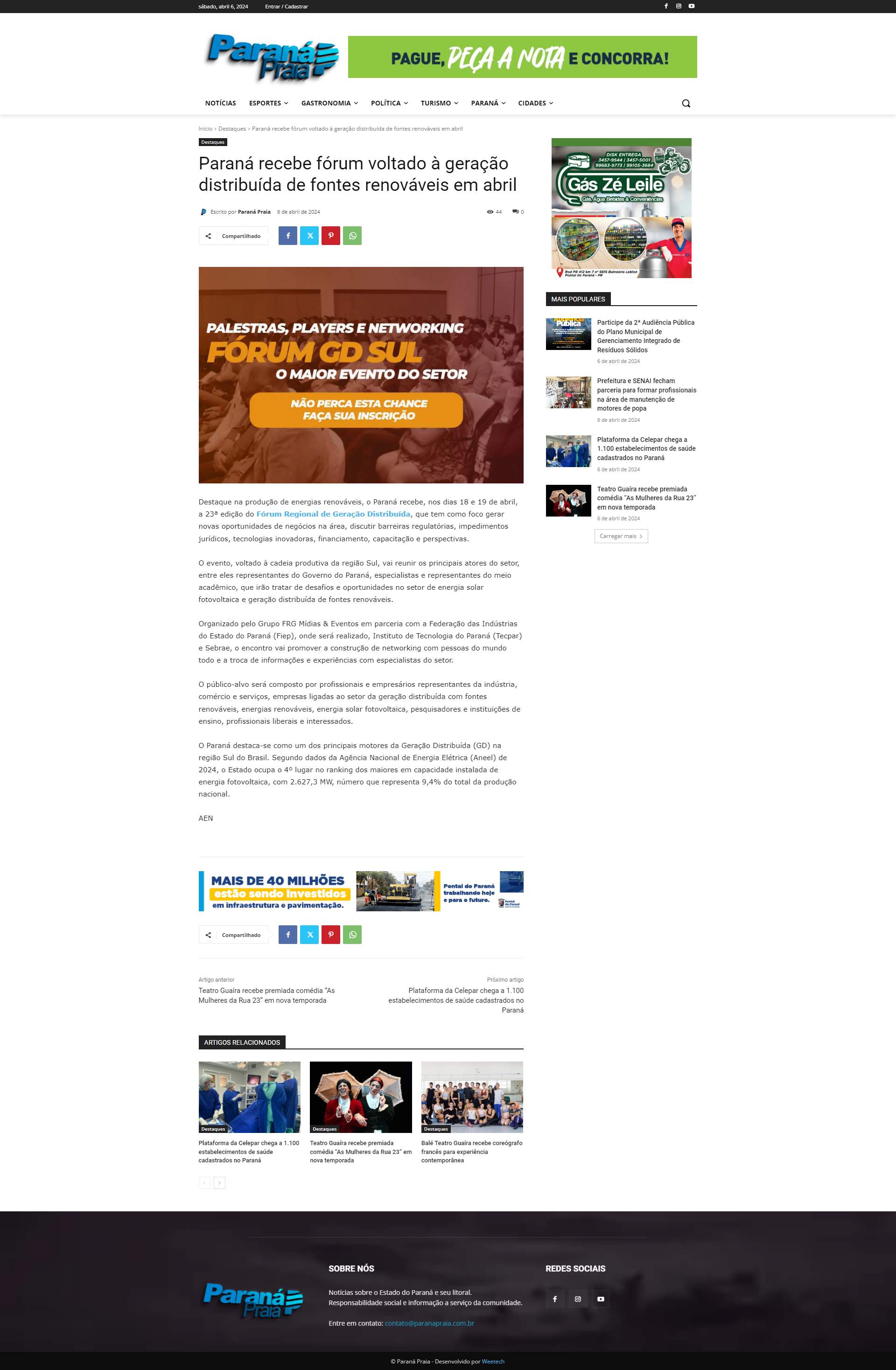 Destaque na produção de energias renováveis, o Paraná recebe, nos dias 18 e 19 de abril, a 23ª edição do Fórum Regional de Geração Distribuída, que tem como foco gerar novas oportunidades de negócios na área, discutir barreiras regulatórias, impedimentos jurídicos, tecnologias inovadoras, financiamento, capacitação e perspectivas.