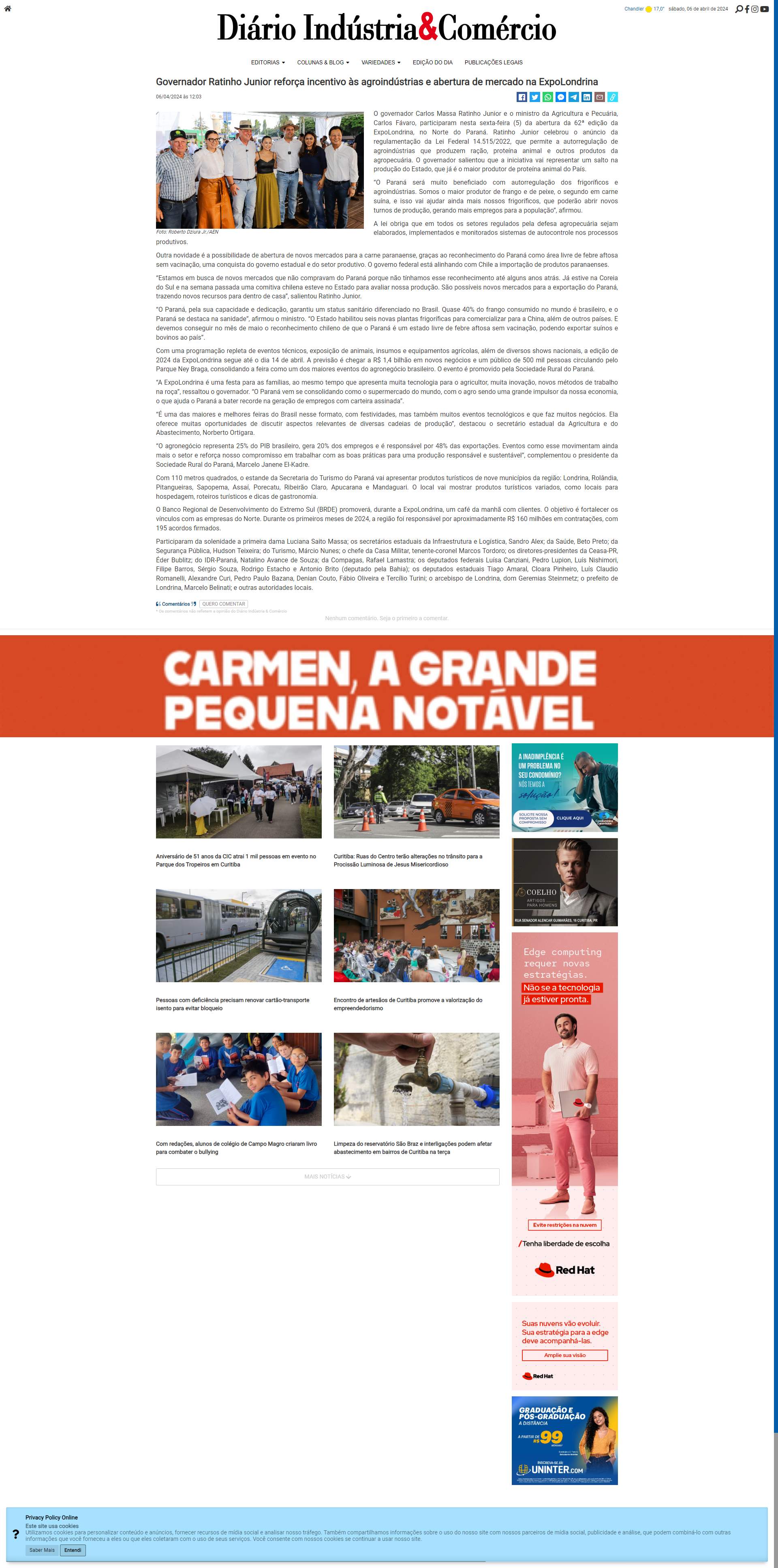 Agricultura e Pecuária, Carlos Fávaro, participaram nesta sexta-feira (5) da abertura da 62ª edição da ExpoLondrina, no Norte do Paraná.