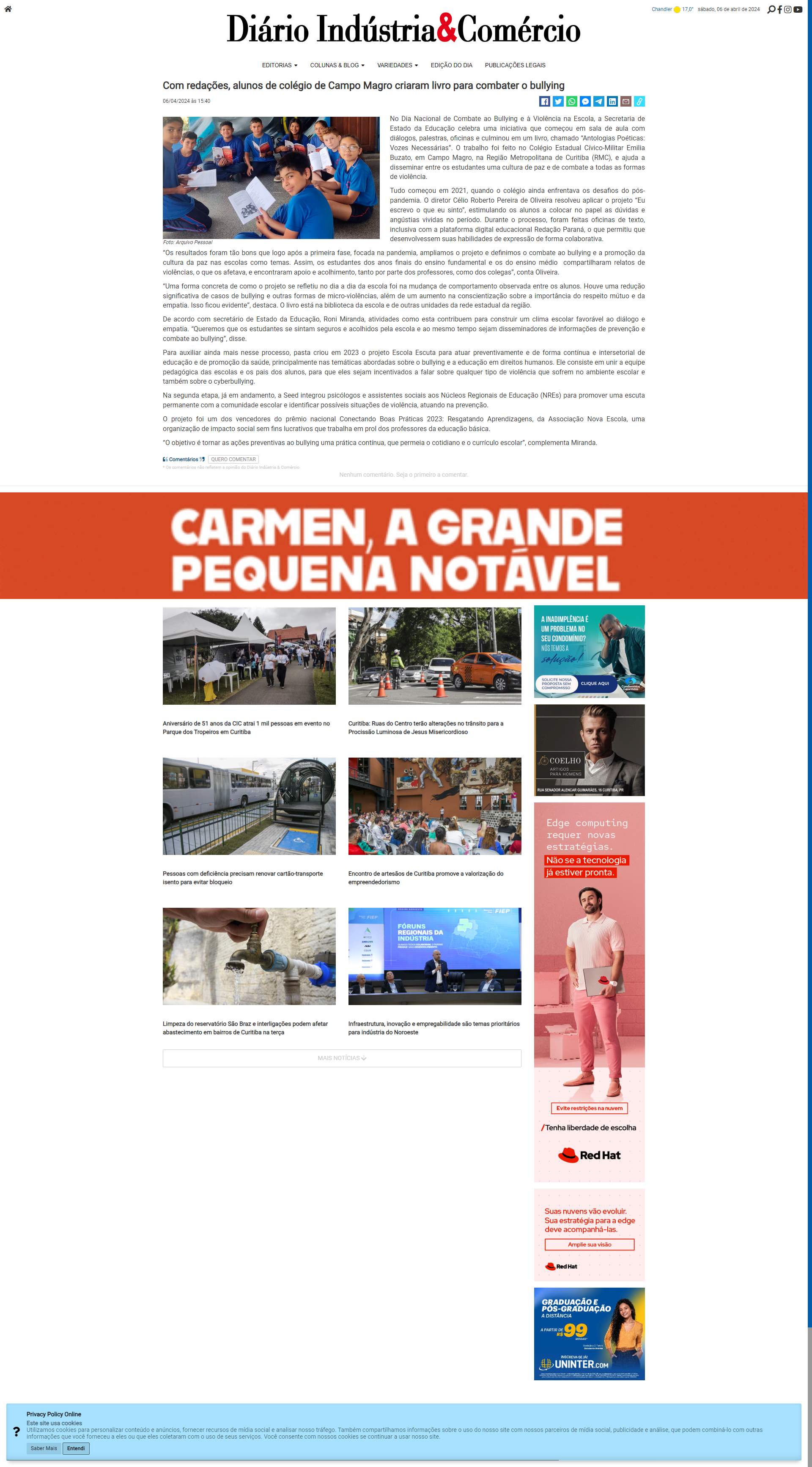 “Uma forma concreta de como o projeto se refletiu no dia a dia da escola foi na mudança de comportamento observada entre os alunos. Houve uma redução significativa de casos de bullying e outras formas de micro-violências, além de um aumento na conscientização sobre a importância do respeito mútuo e da empatia. Isso ficou evidente”, destaca. O livro está na biblioteca da escola e de outras unidades da rede estadual da região.