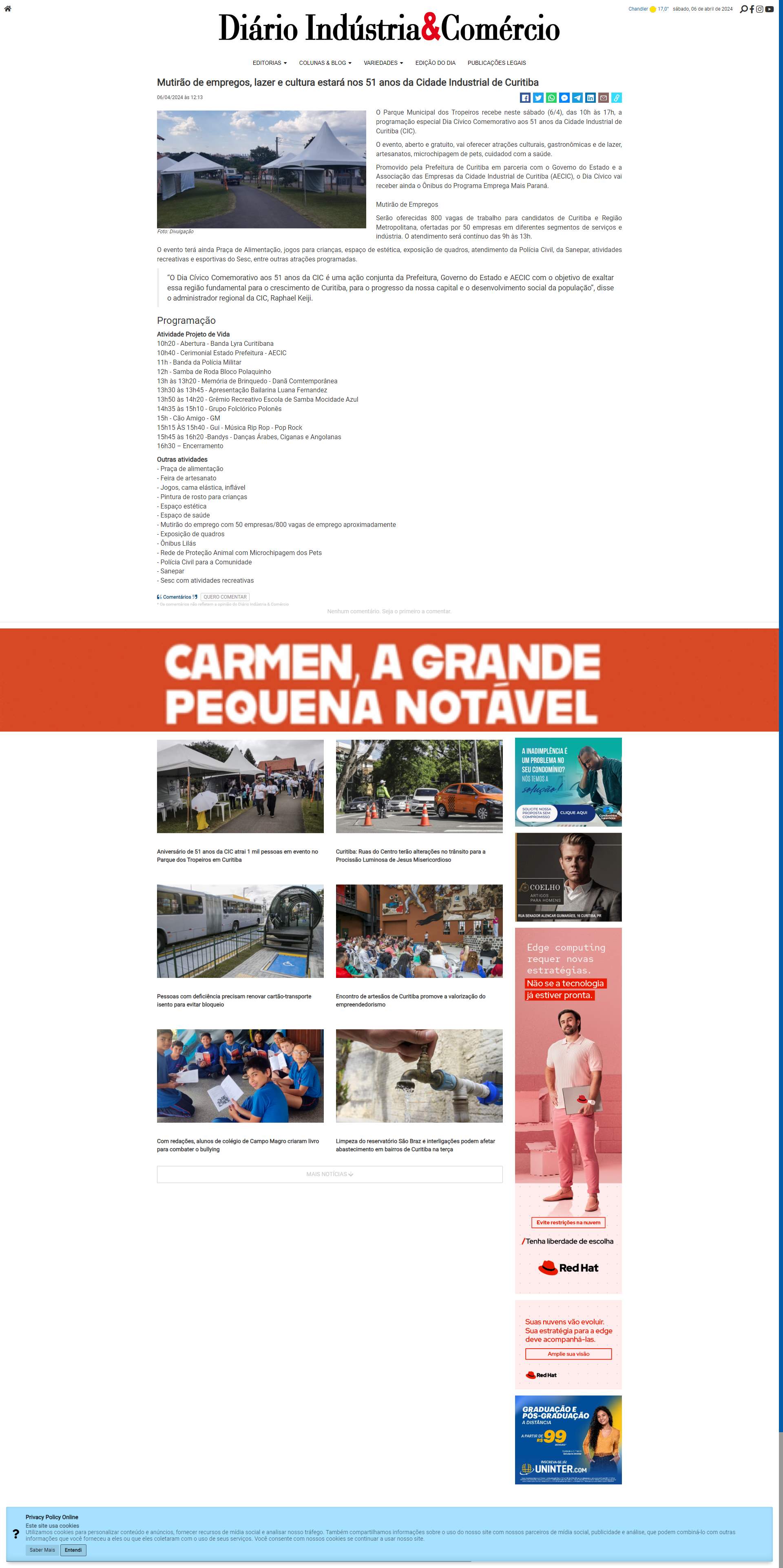 O Parque Municipal dos Tropeiros recebe neste sábado (6/4), das 10h às 17h, a programação especial Dia Cívico Comemorativo aos 51 anos da Cidade Industrial de Curitiba (CIC).