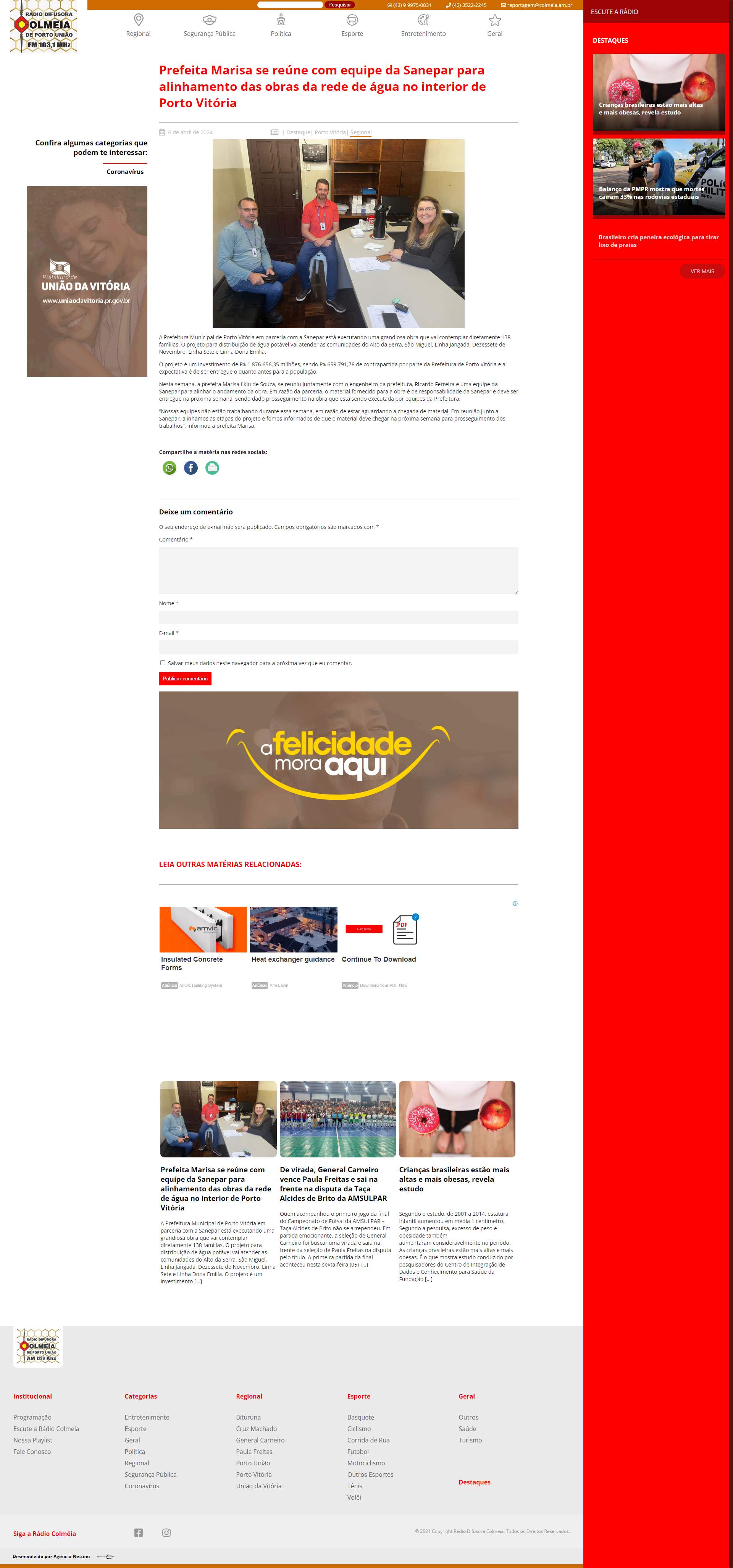 Sanepar para alinhar o andamento da obra. Em razão da parceria, o material fornecido para a obra é de responsabilidade da