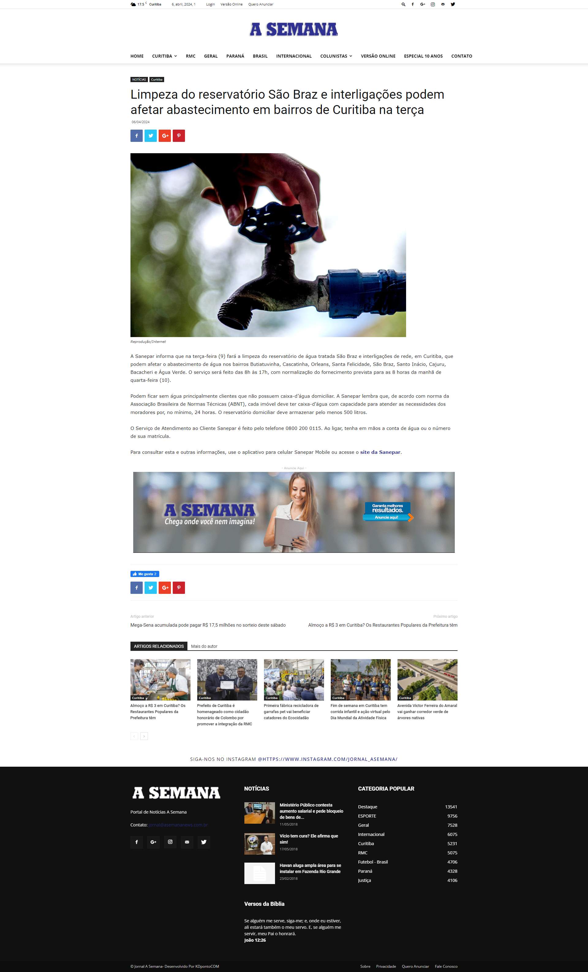 Sanepar informa que na terça-feira (9) fará a limpeza do reservatório de água tratada São Braz e interligações de rede, em Curitiba, que podem afetar o abastecimento de água nos bairros Butiatuvinha, Cascatinha, Orleans, Santa Felicidade, São Braz, Santo Inácio, Cajuru, Bacacheri e Água Verde. O serviço será feito das 8h às 17h, com normalização do fornecimento prevista para as 8 horas da manhã de quarta-feira (10).